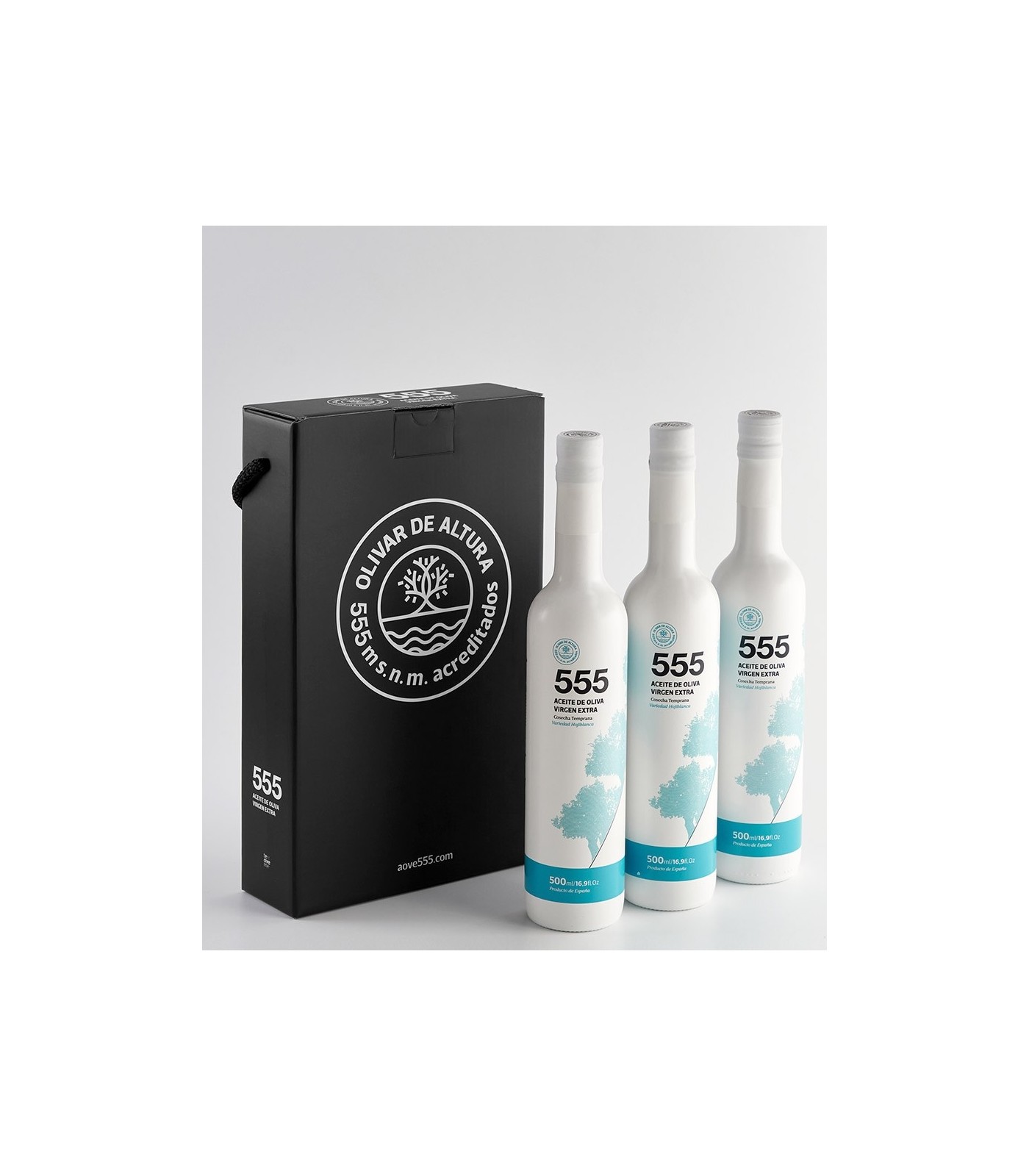 Dieses Etui mit Griff enthält 3 Glasflaschen mit 500 ml. 100% natives Olivenöl extra Hojiblanca aus früher Ernte und Kaltextraktion, hergestellt in Teba (Málaga).