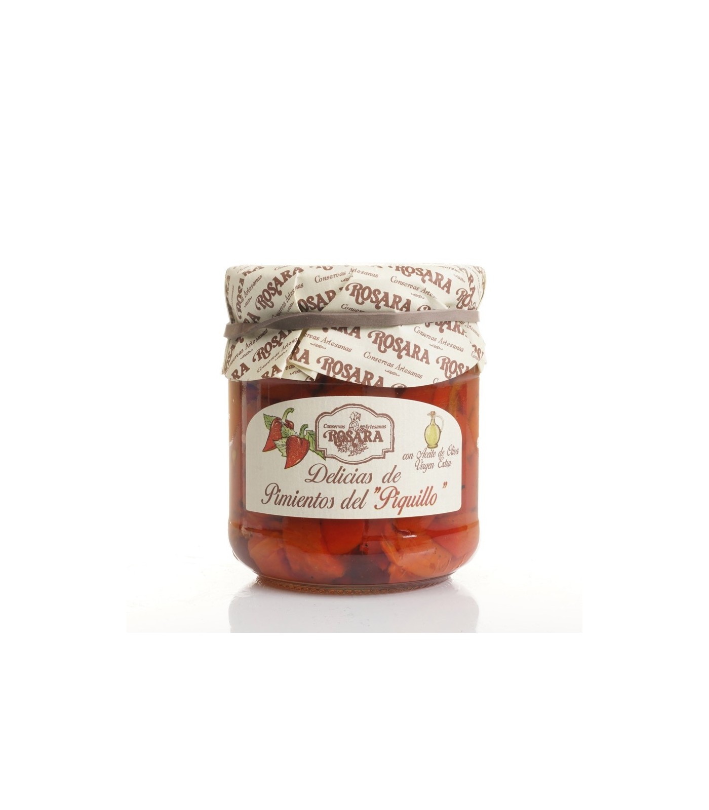 Conservas Artesanas Rosara röstet seine Piquillo-Paprikaschoten mit Buchenholz und schält sie ohne Wasser, um ihr ganzes Aroma zu erhalten. Sie werden in Streifen geschnitten und erneut in einer speziellen Marinade geröstet. Zum Schluss werden sie mit nativem Olivenöl extra veredelt. Das Ergebnis ist eine süße Paprika mit einem intensiveren Piquillo-Geschmack. Und mit nur 6,5 % Fett.