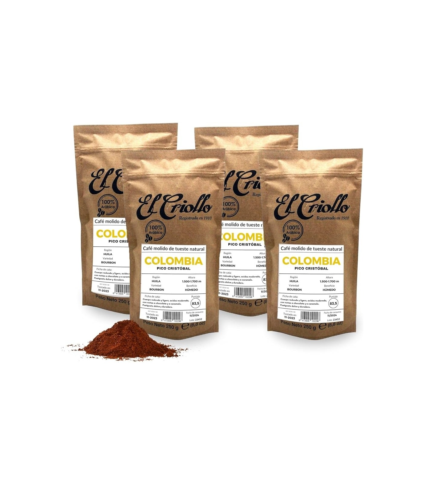 Diese Packung enthält 4 Einheiten von El Criollo Colombian Coffee Ground 250 gr.