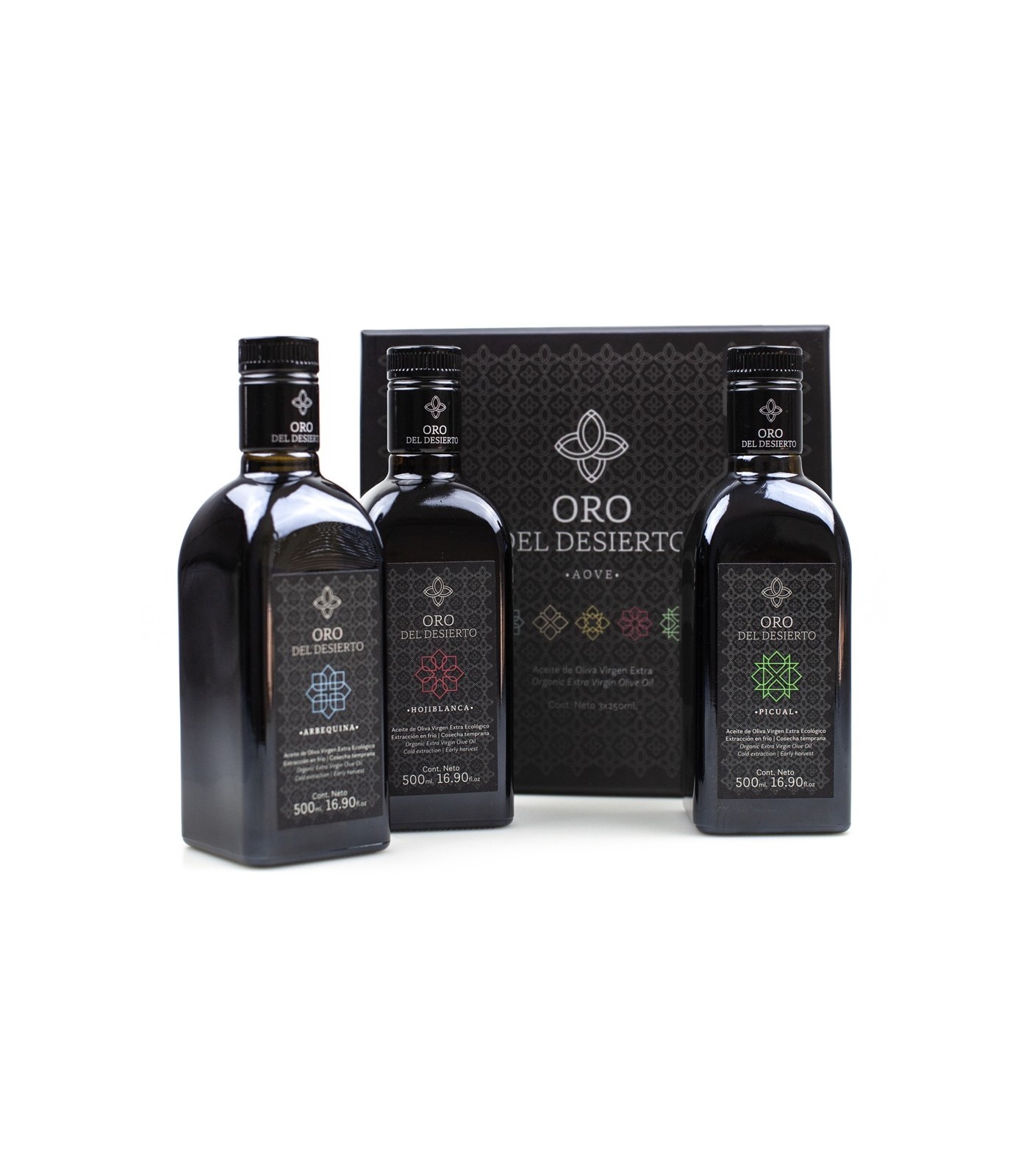 Geschenketui enthält 3 Glasgefässe 500 ml.: Oro del Desierto Arbequina, Oro del Desierto Hojiblanca und Oro del Desierto Picual.