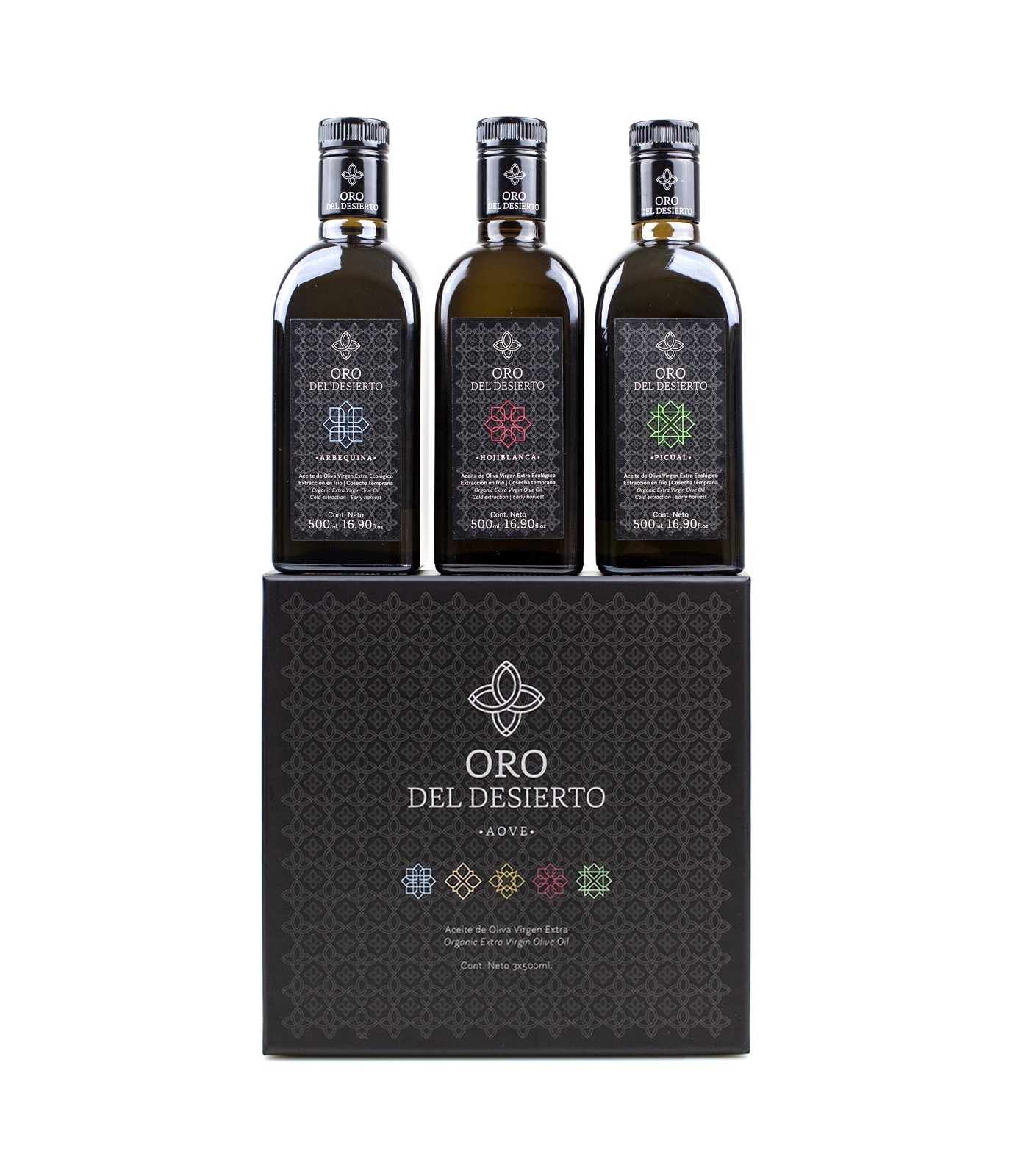 Geschenketui enthält 3 Glasgefässe 500 ml.: Oro del Desierto Arbequina, Oro del Desierto Hojiblanca und Oro del Desierto Picual.