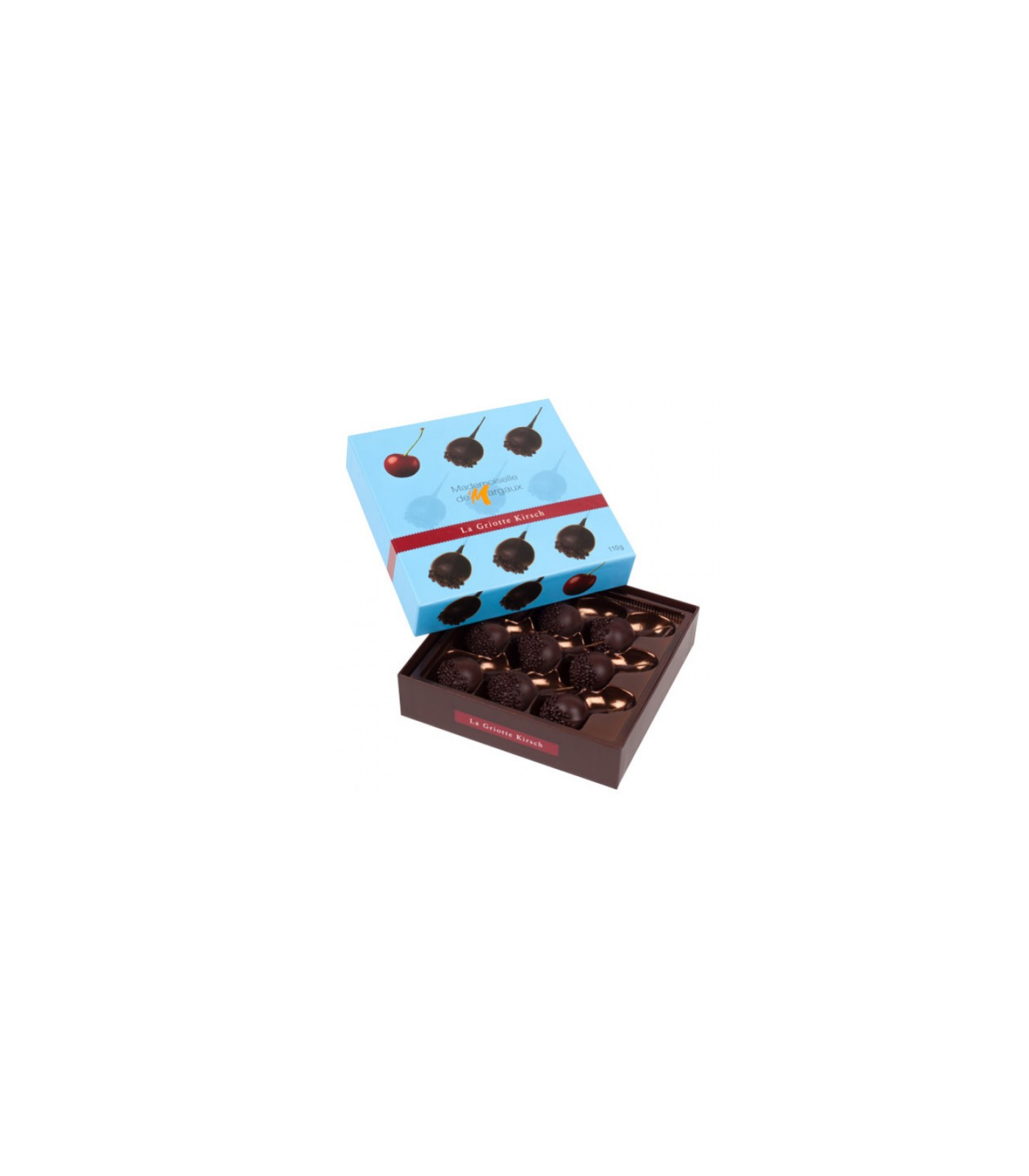 Hergestellt aus Zartbitterschokolade, Kirschlikör (24°), Zucker, Armagnac (40% vol: 0,5%) und Vollmilchpulver.