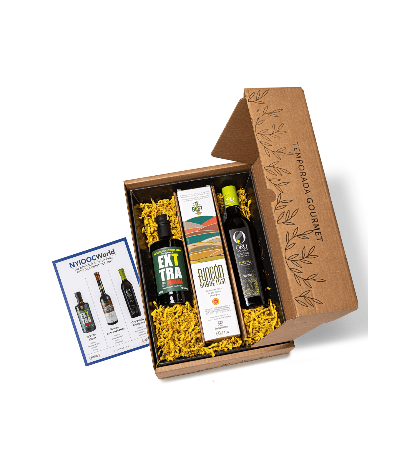Diese Geschenkbox enthält die besten nativen Olivenöle extra der Welt im Jahr 2019 laut der renommierten New York International Olive Oil Competition.