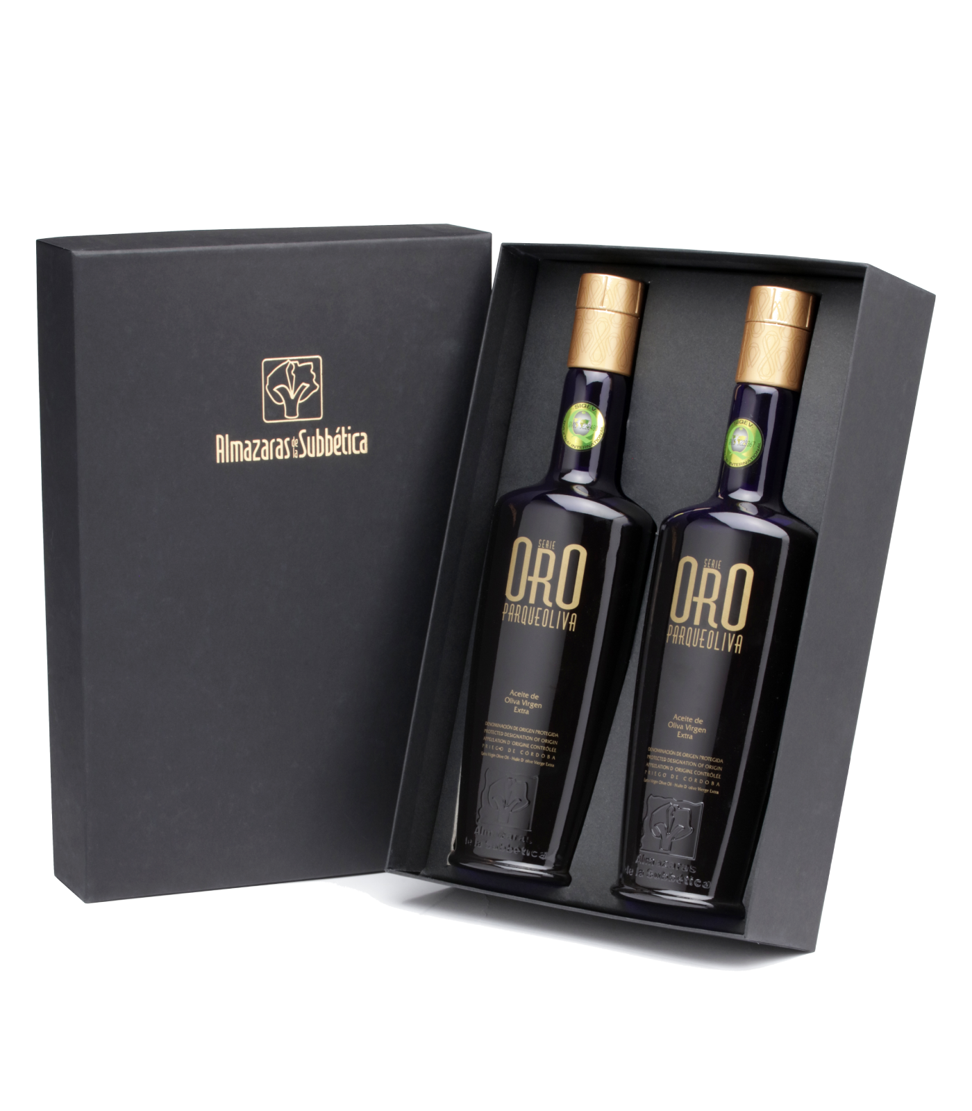 Elegantes schwarzes Etui mit Siebdruck und 2 Flaschen Parqueoliva Serie Oro (500 ml), eines der meist ausgezeichneten Olivenöle der Welt.