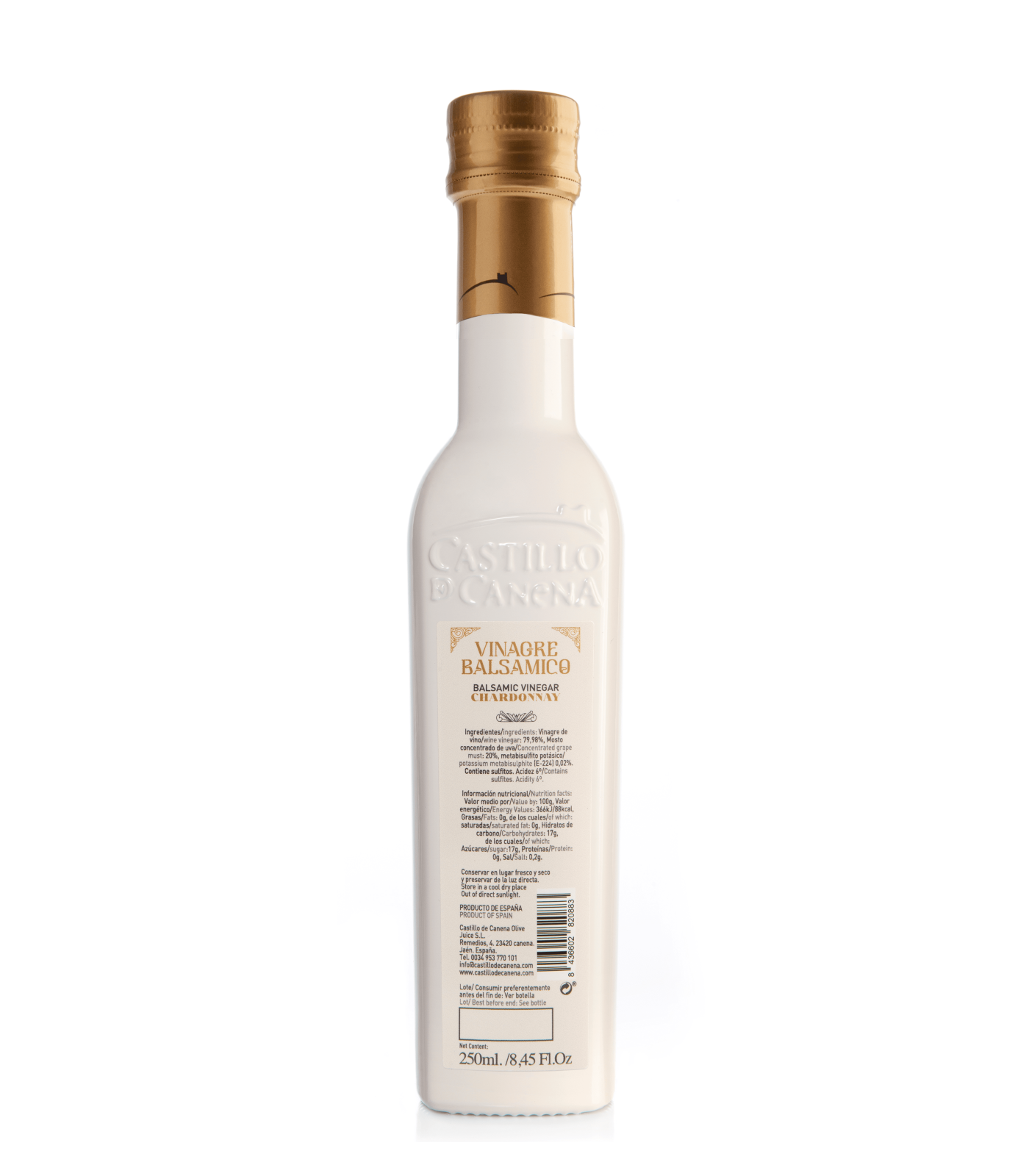 White balsamic vinegar made from Chardonnay grapes grown on the Castillo de Canena estate, in the province of Jaén, and acidified by the master vinegar makers of El Majuelo, in Jerez de la Frontera.