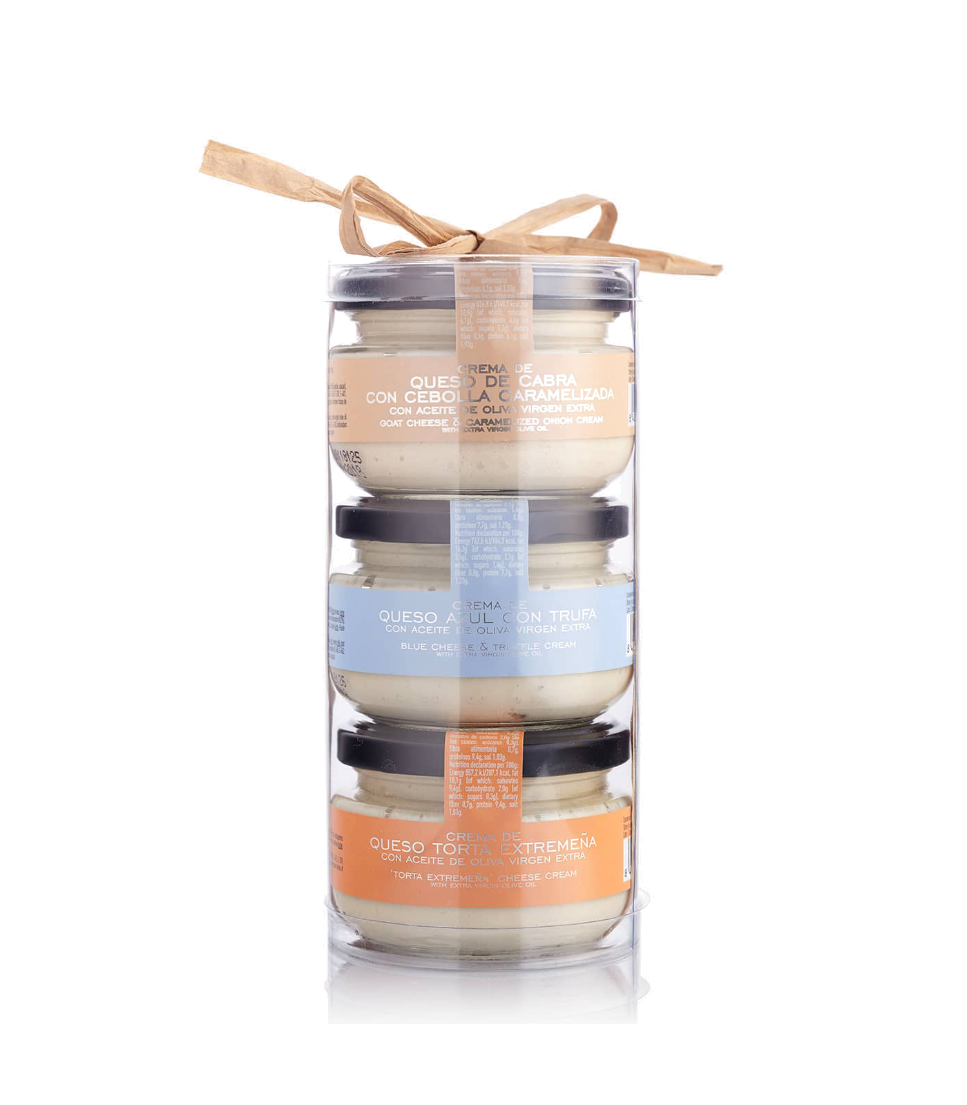 This pack includes goat cheese cream with caramelised onion, blue cheese cream with truffle and torta extremeña cream cheese.