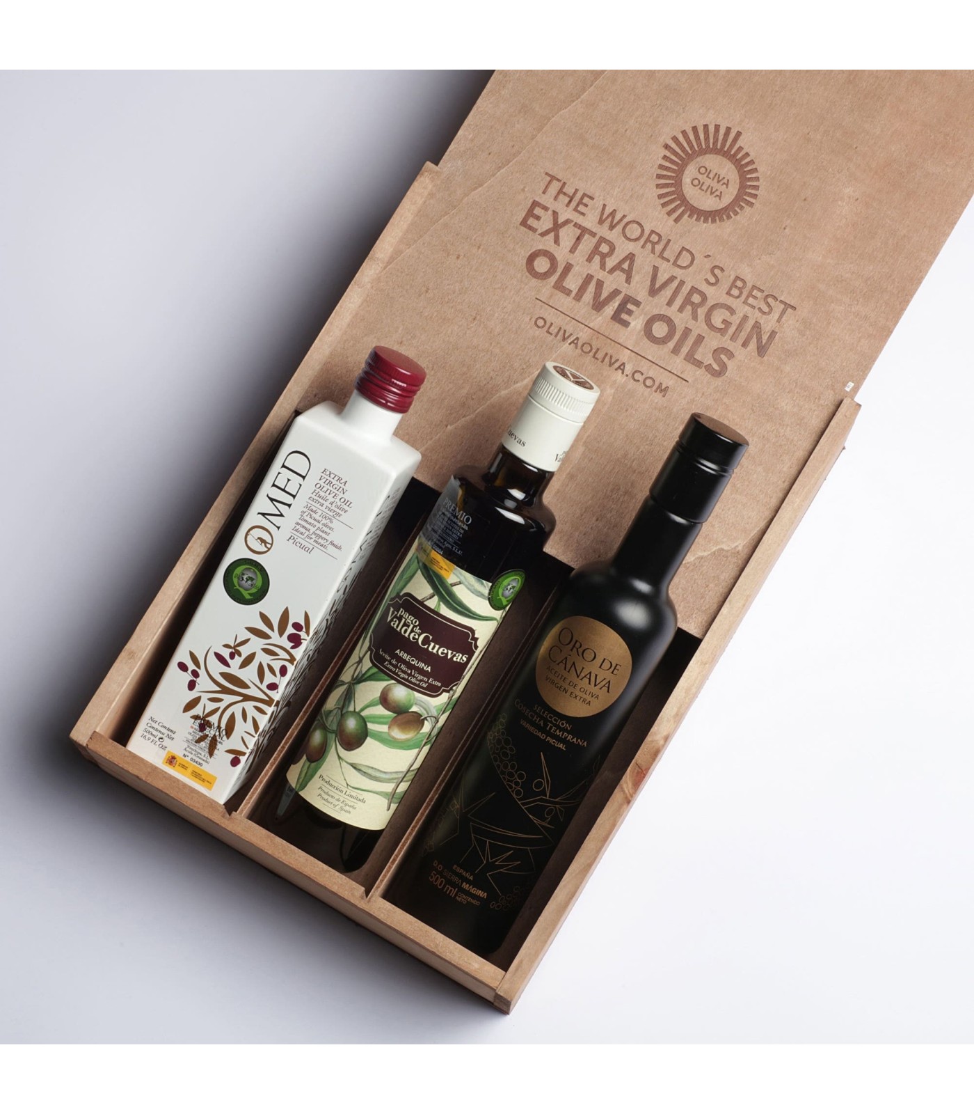 This wooden box includes the 3 best extra virgin olive oils in Spain in 2021, awarded with the Alimentos de España Award.