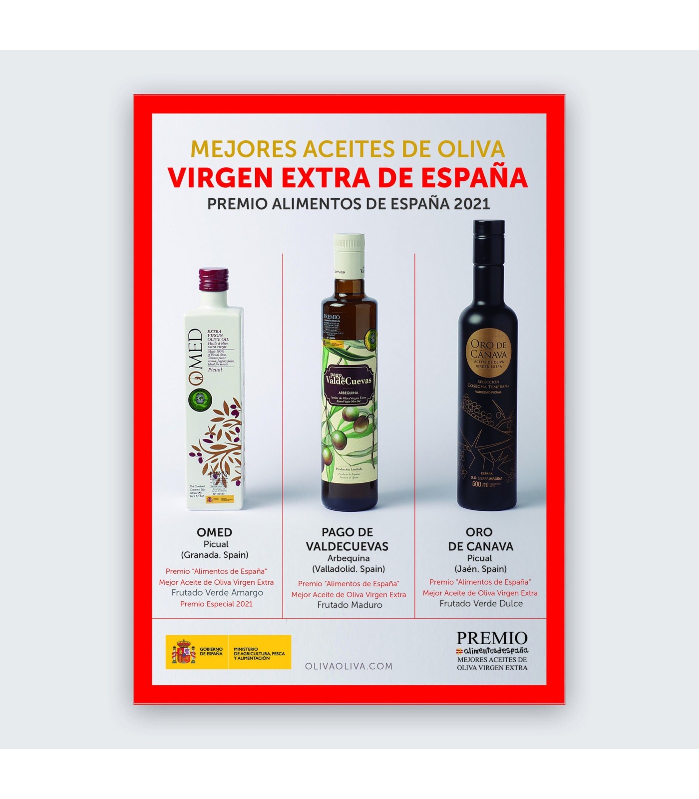 It rewards the best Spanish extra virgin olive oils in three categories: Best Bitter Green Fruity, Best Sweet Green Fruity and Best Mature Fruity. In turn, the oil that obtains the highest total score is awarded the Alimentos de España Special Award for Best Extra Virgin Olive Oil.