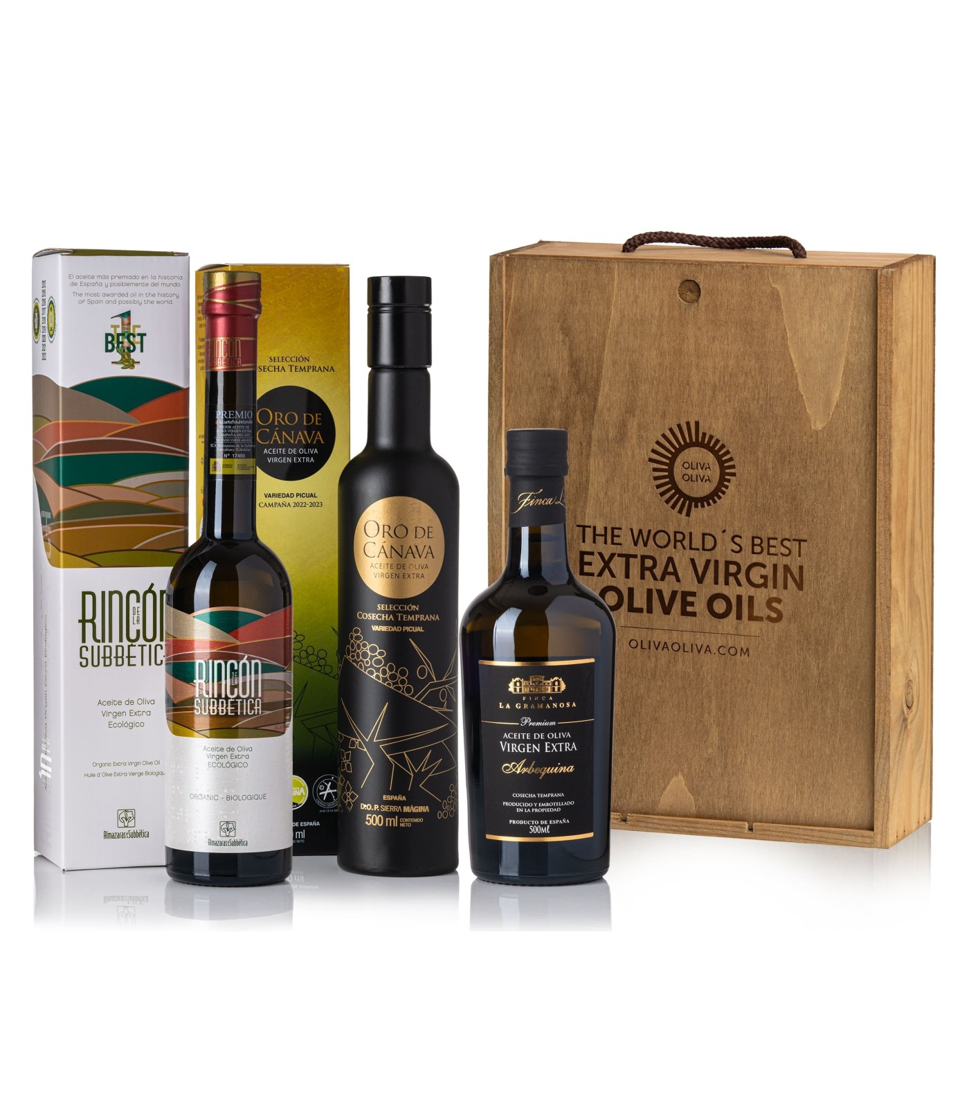 This wooden box includes the 3 best extra virgin olive oils in Spain in 2023, awarded with the Alimentos de España Award.