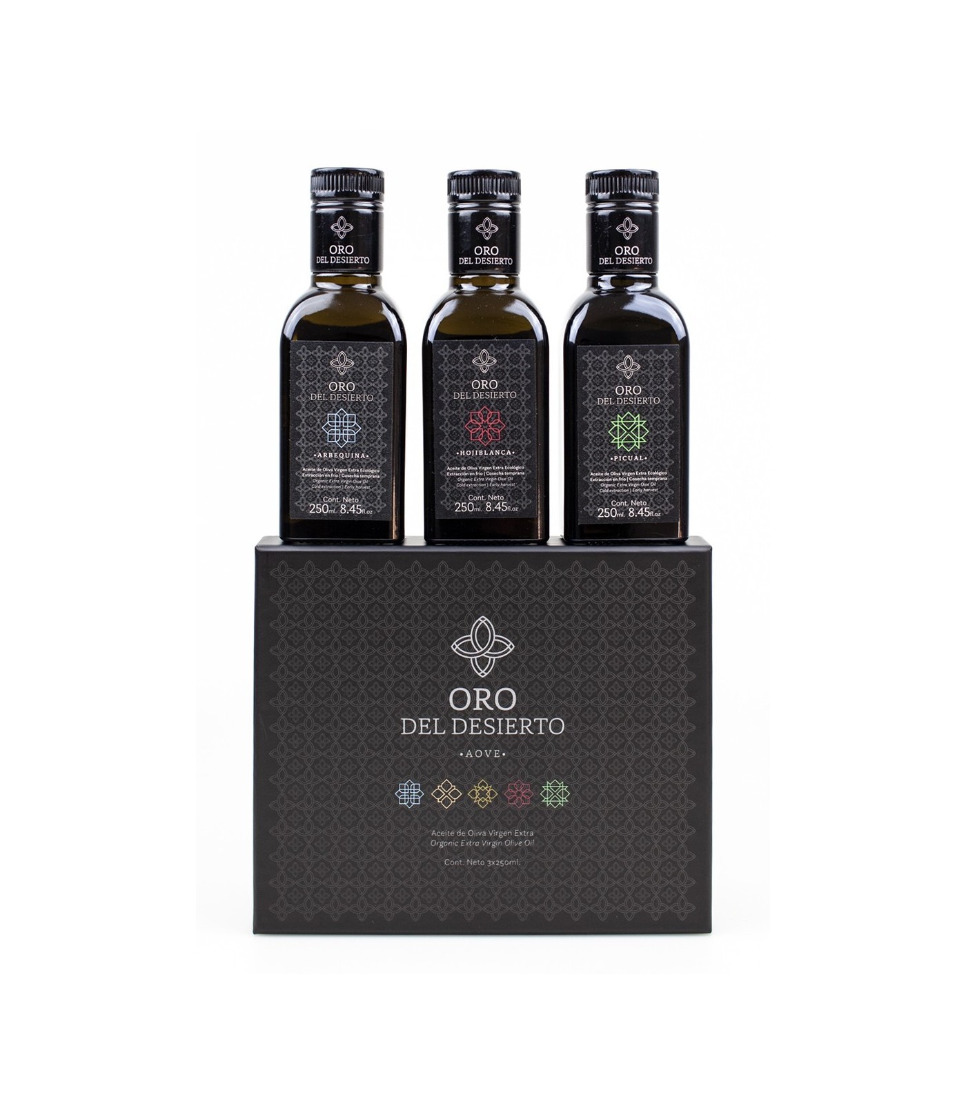 Box containing 3 squared glass 250 ml.: Oro del Desierto Arbequina, Oro del Desierto Hojiblanca and Oro del Desierto Picual.