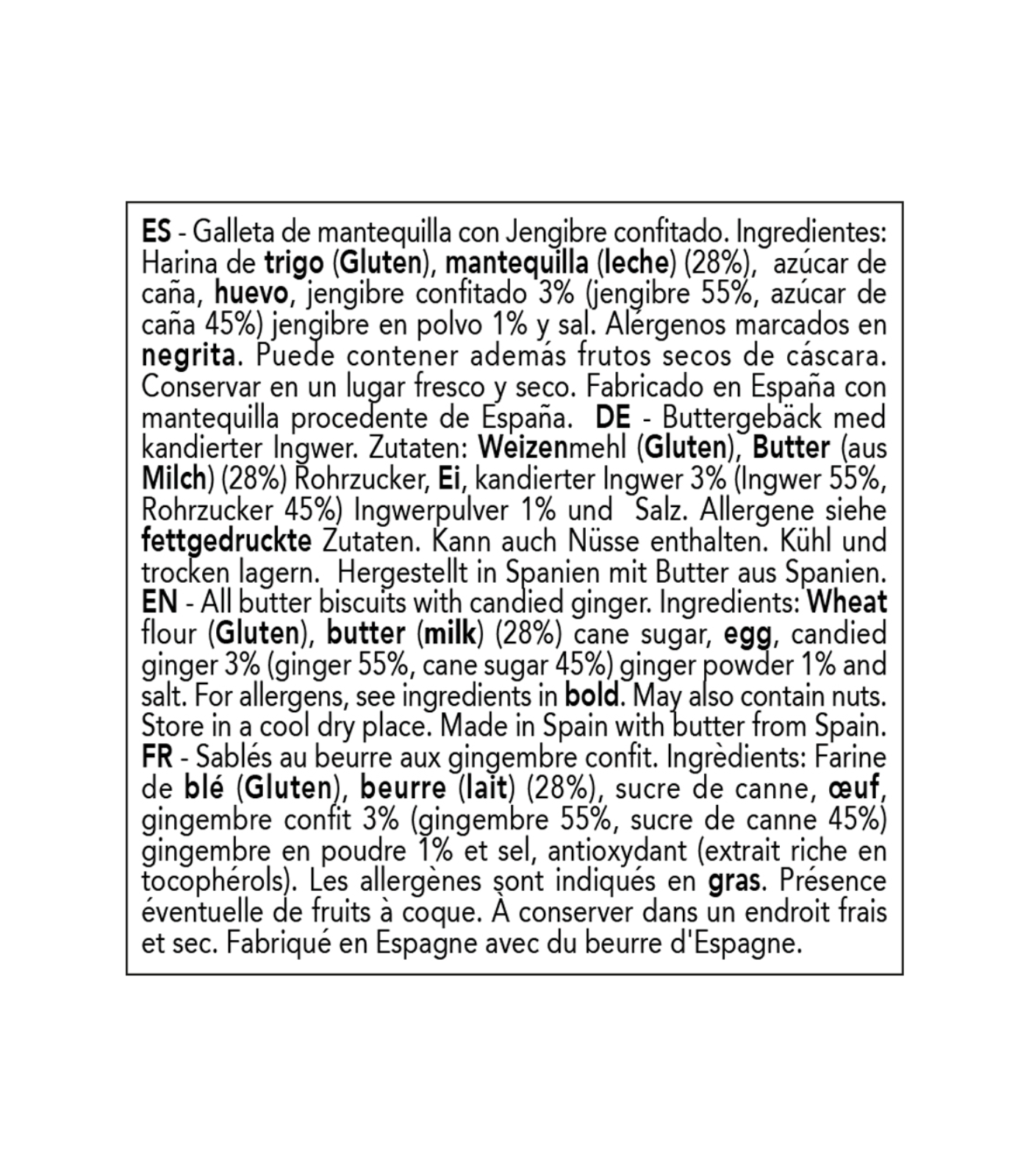Ingredientes: Harina de trigo (gluten), mantequilla (leche) (28%), azúcar de caña, huevo, jengibre confitado 3% (jengibre 55%, azúcar de caña 45%), jengibre en polvo 1% y sal. Alérgenos marcados en negrita. Puede contener además frutos secos de cáscara. Conservar en un lugar fresco y seco. Producto fabricado en España con mantequilla procedente de España. Sin aceite de palma.