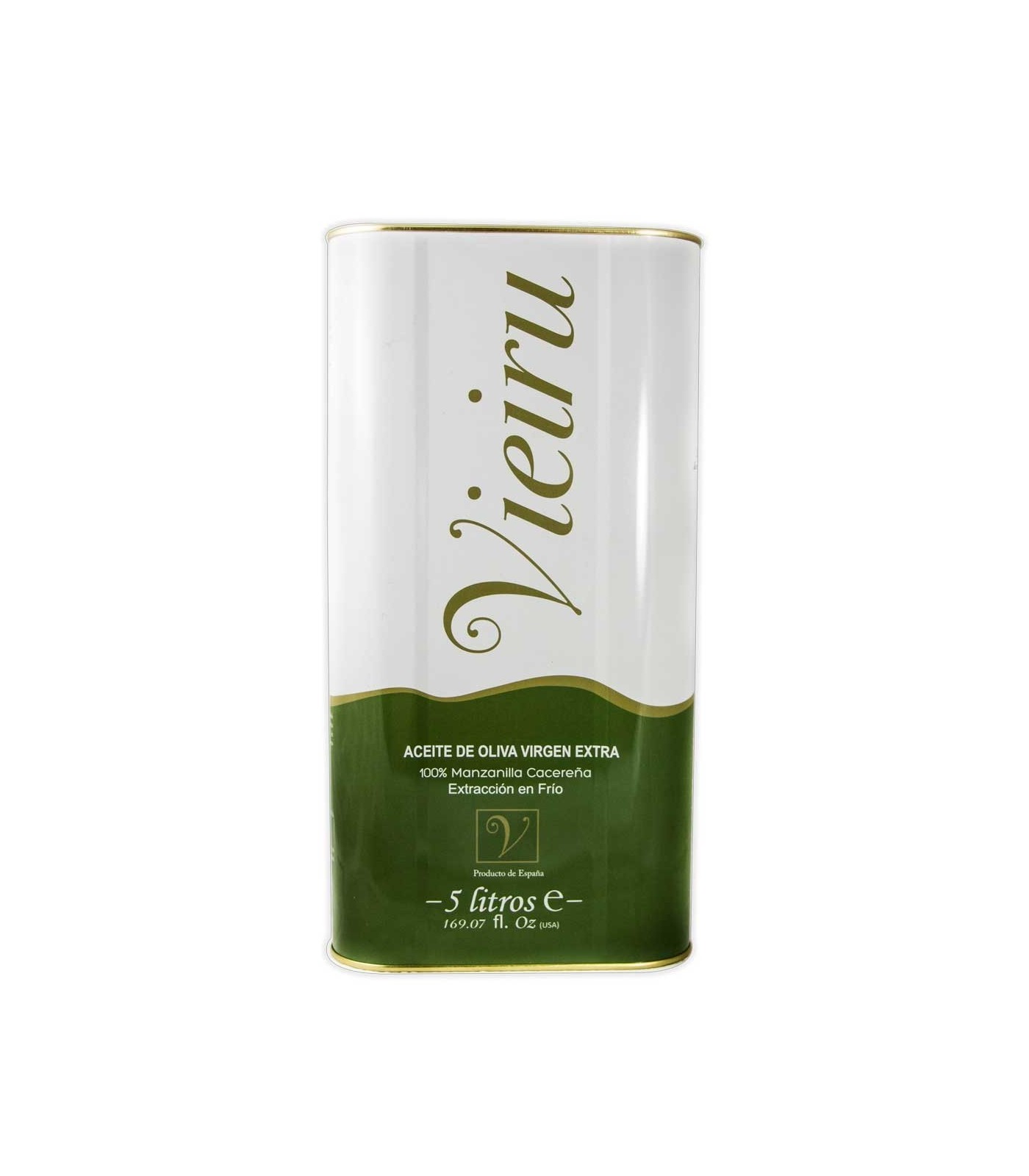 Presentado en un cómodo formato de lata de 5 litros, el Aceite de Oliva Virgen Extra Vieiru está pensado para quienes desean disfrutar de su excepcional calidad en mayores cantidades, para llevar el sabor de sus platos cotidianos a otro nivel.