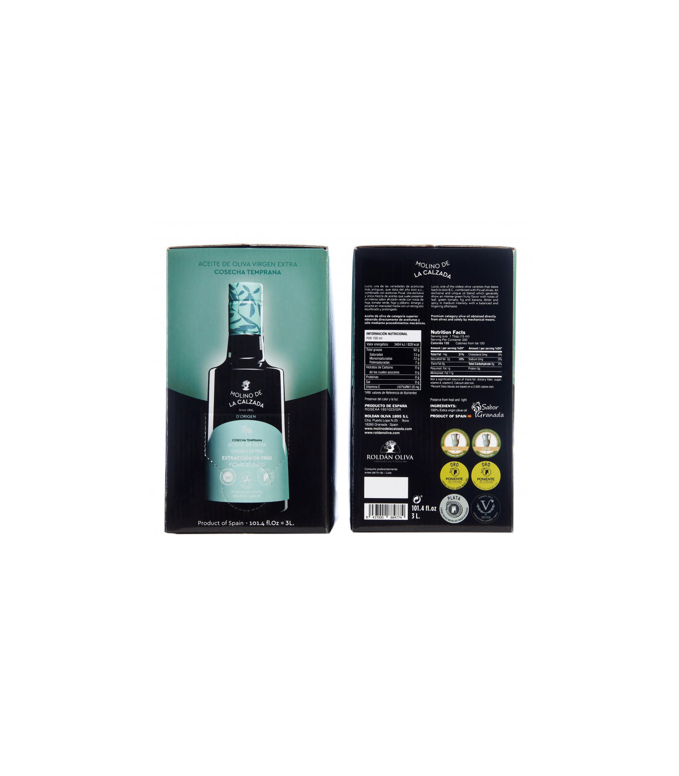 Aceite de Oliva Virgen Extra de primera calidad de las variedades Picual y Lucio, producido en la provincia de Granada.