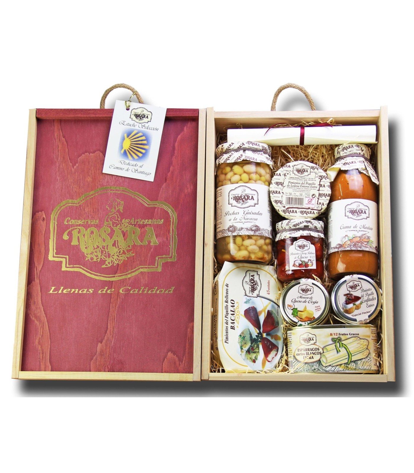 Se trata de un estuche de madera con una exquisita selección de productos de Conservas Artesanas Rosara. En él han querido rendir homenaje a uno de los caminos que han marcado la historia. Se trata del Camino de Santiago, cuyos dos caminos principales se unen en Navarra y además es uno de los patrimonios culturales más apreciados de España. En el interior del estuche se incluye un pergamino explicativo del Camino de Santiago.