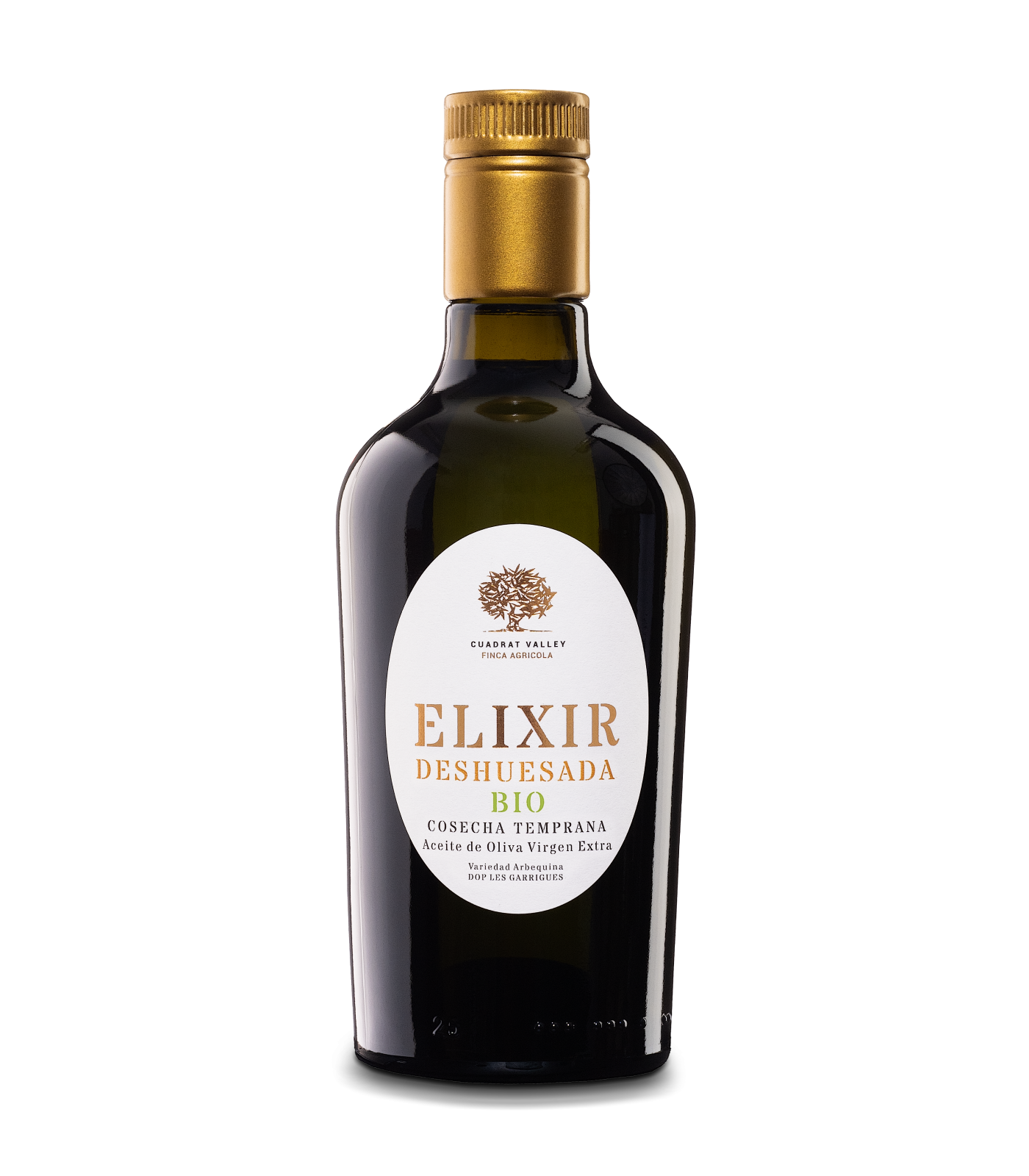 Aceite de oliva virgen extra ecológico de L'Albagés (Lleida) producido con aceitunas de la variedad Arbequina y amparado bajo la Denominación de Origen Protegida Les Garrigues. Las aceitunas se cosechan temprano y se deshuesan antes de pasar por las 10 etapas clásicas de la producción de aceite de oliva. De promedio, se necesitan 12 kg. de aceitunas Arbequina para obtener 1 litro de Elixir Deshuesada BIO.