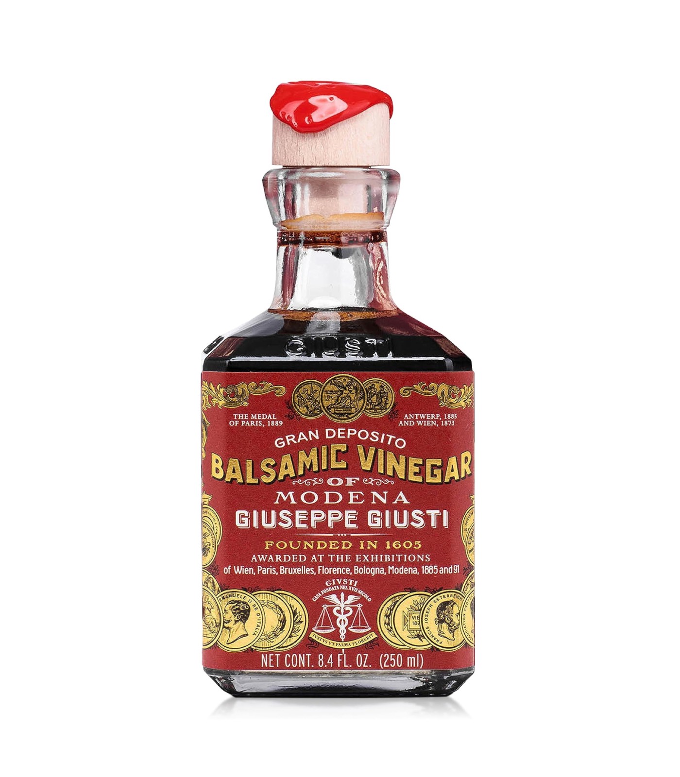 El vinagre balsámico Giusti de Modène IGP 3 medallas de oro es una receta familiar que se remonta al abuelo de la familia Giusti, inventor de la receta a principios del siglo XX. Este vinagre se elabora a partir del mosto de uvas maduras y secas, y ofrece aromas de mermelada de ciruelas y frutos rojos, así como notas de miel y vainilla. Se envejece en barricas, con la adición de vinagre balsámico previamente envejecido, extraído de baterías de barricas centenarias.