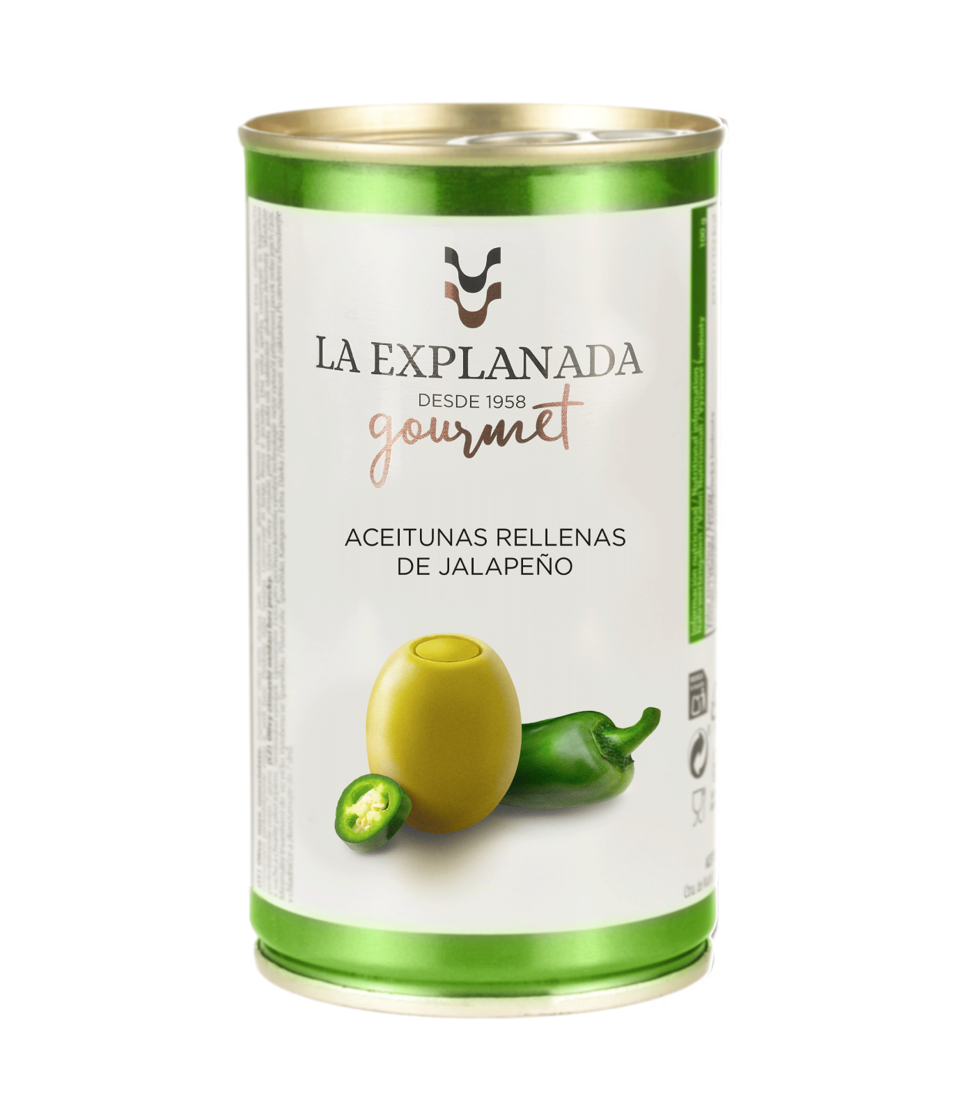 Las aceitunas rellenas de jalapeño de La Explanada son la opción perfecta para quienes buscan un aperitivo gourmet con un toque picante. Rellenas con una sabrosa pasta de jalapeño, ofrecen una experiencia gustativa intensa que sorprenderá a los paladares más atrevidos. Cada bocado es un equilibrio perfecto entre lo salado y lo picante.