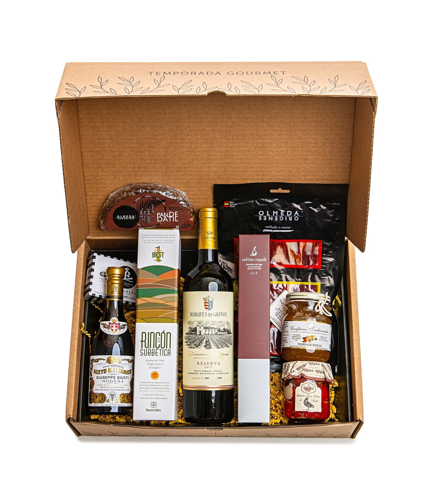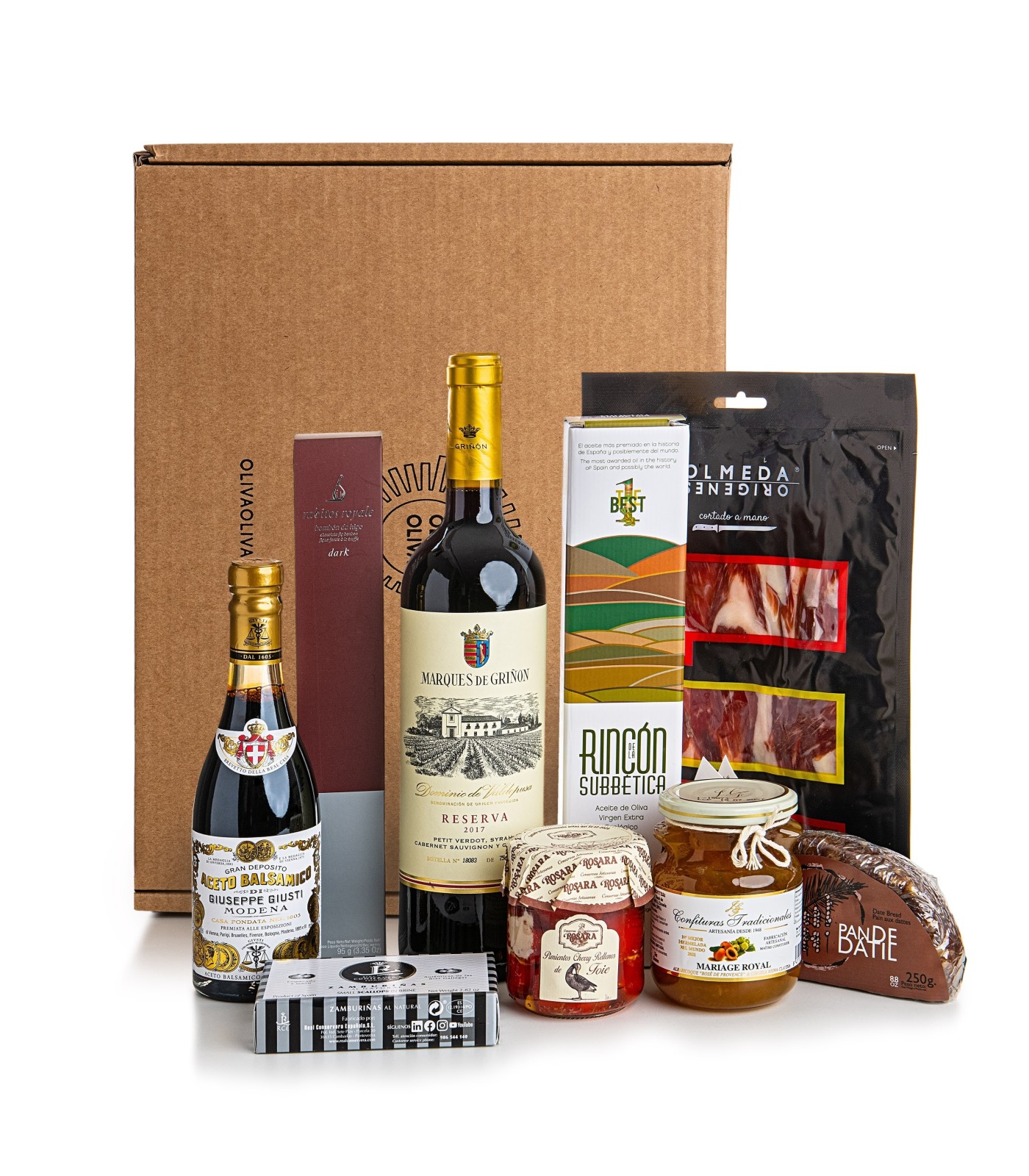 La cesta gourmet Élite de Oliva Oliva incluye un inigualable surtido de aceite de oliva virgen extra premium, vino, ibéricos, conservas y dulces de primera calidad. Se presenta en una exclusiva caja de edición limitada con un diseño muy atractivo, lo que la convierte en una excelente opción para regalo.