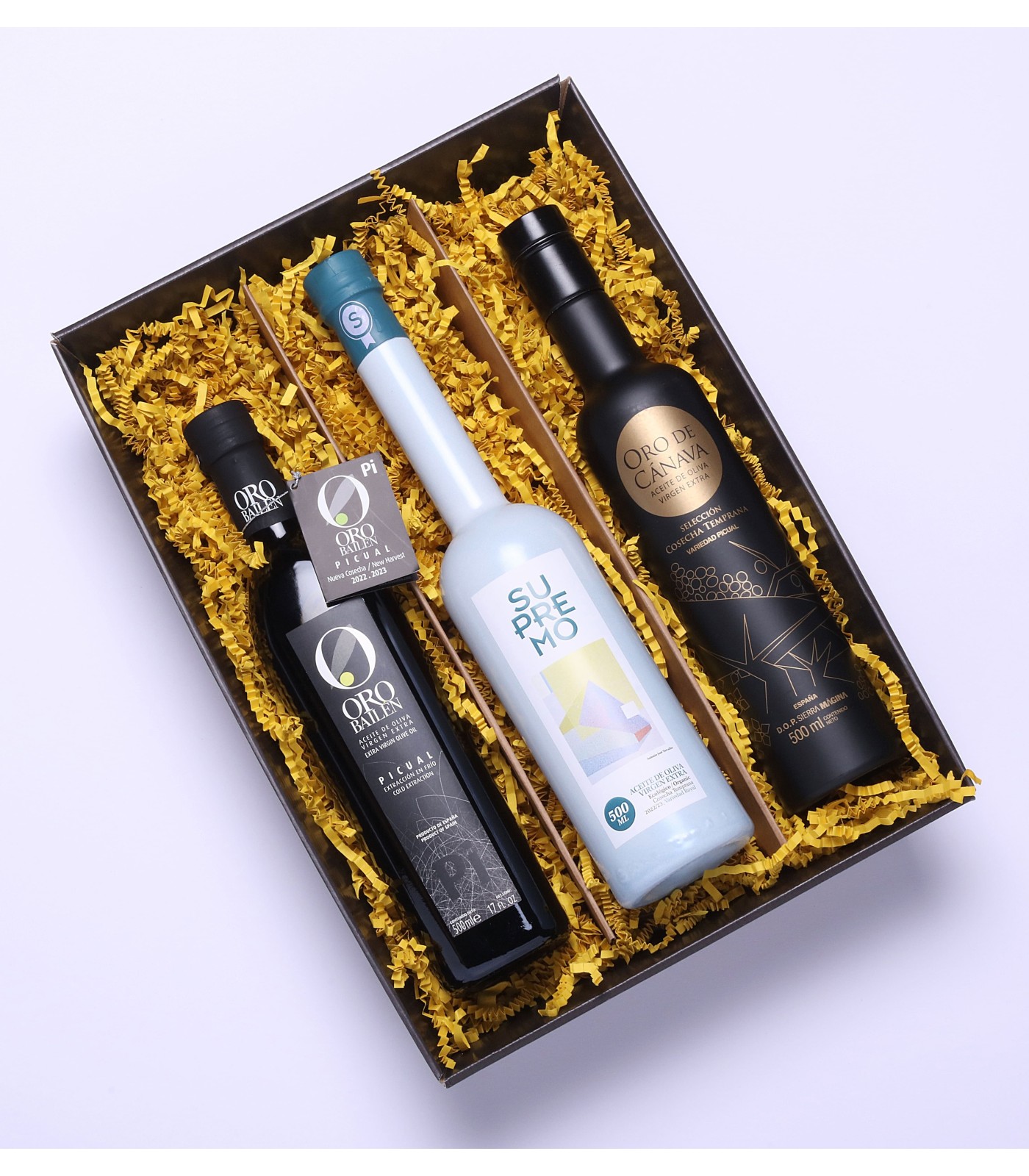 Esta caja regalo incluye 3 de los mejores aceites de oliva virgen extra de Jaén en el año 2023, galardonados en Jaén Selección.