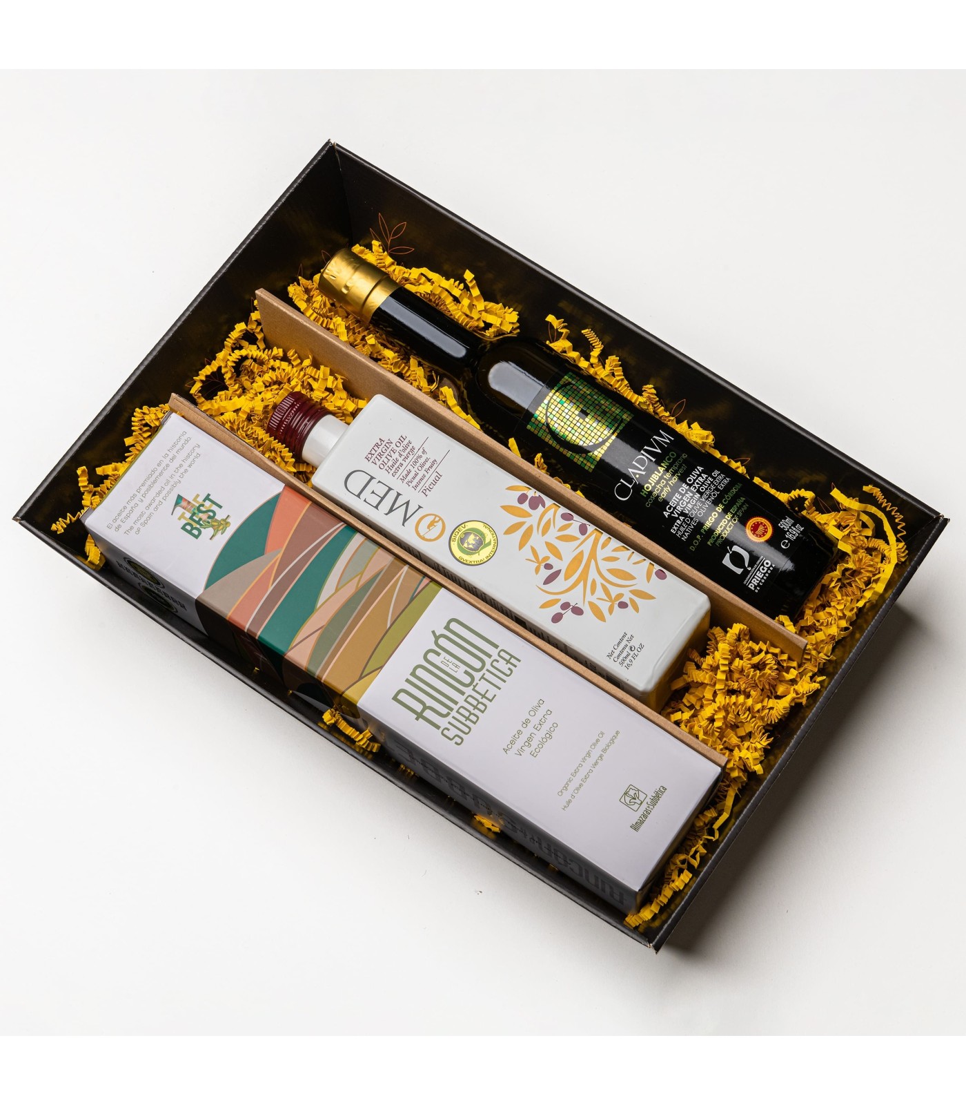 Esta caja regalo incluye los mejores aceites de oliva virgen extra del mundo en el año 2022, premiados con el Olio Award, galardón otorgado por la revista alemana Der Feinschmecker.