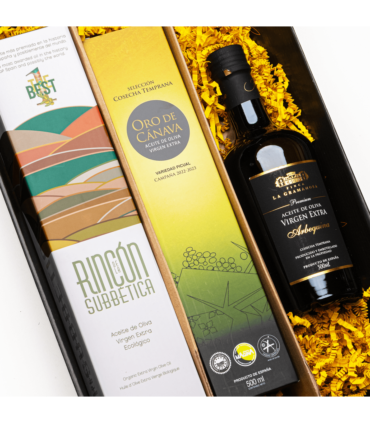 Esta caja regalo incluye los 3 mejores aceites de oliva virgen extra de España en el año 2023, galardonados con el Premio Alimentos de España.