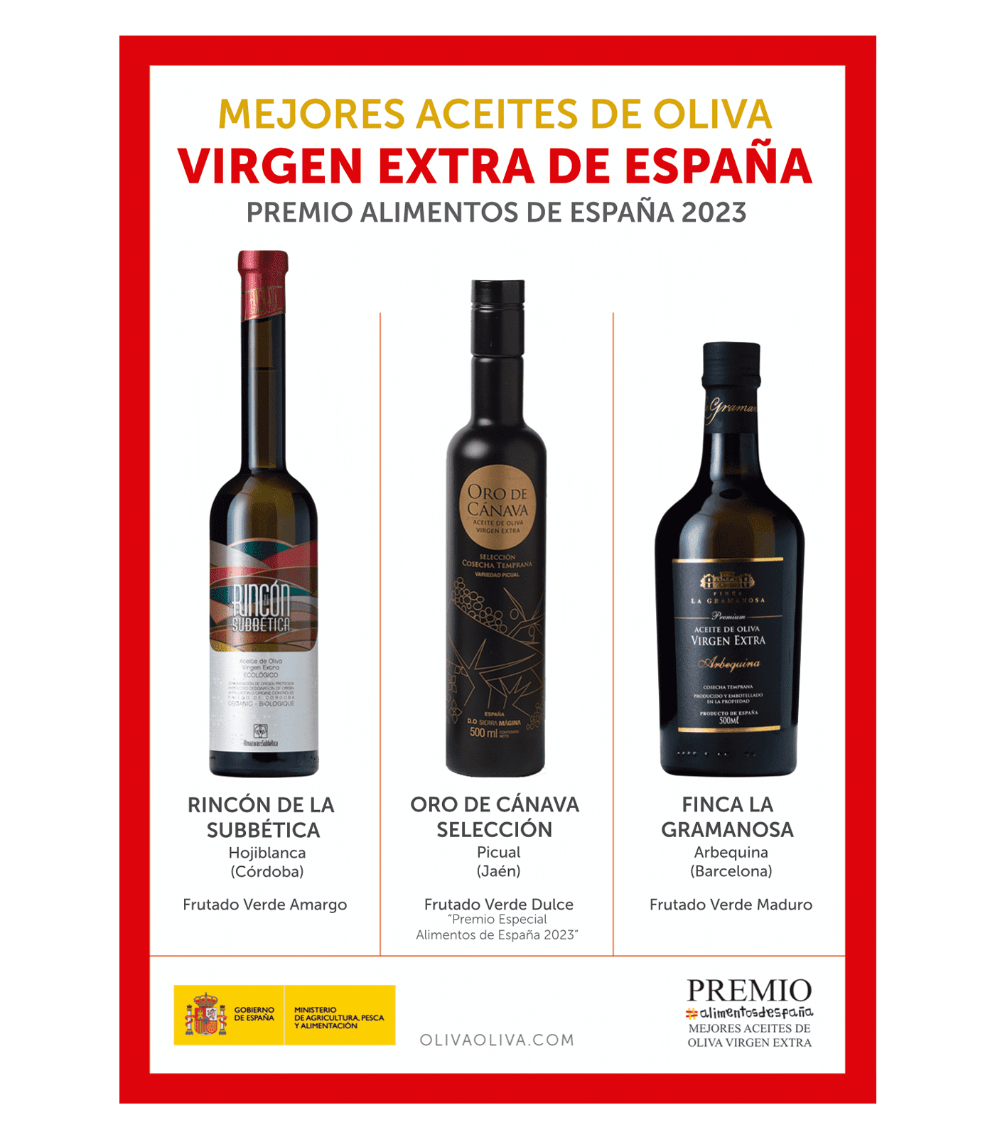 Se premia a los mejores aceites de oliva virgen extra españoles en tres categorías: Mejor Frutado Verde Amargo, Mejor Frutado Verde Dulce y Mejor Frutado Maduro. A su vez, el aceite que obtiene mayor puntuación total es galardonado con el Premio Especial Alimentos de España Mejor Aceite de Oliva Virgen Extra.
