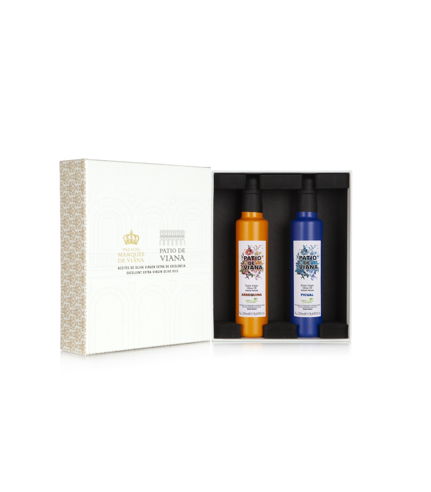 Estuche de dos botellas de aceites de oliva virgen extra, Patio de Viana Arbequina y Patio de Viana Picual.