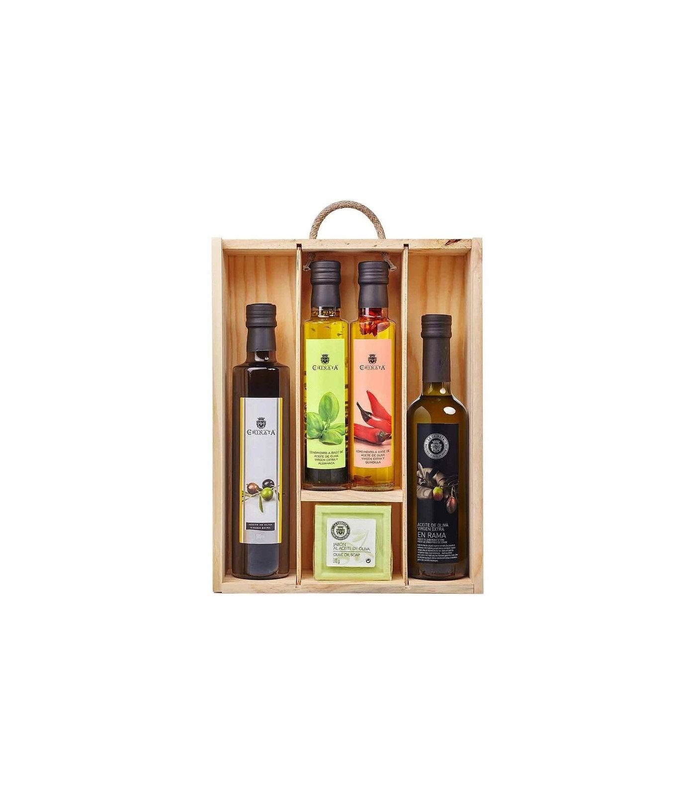 El Estuche de Regalo Grande La Chinata contiene una botella de Aceite de Oliva Virgen Extra La Chinata ‘En rama’, una botella de AOVE de cristal, un AOVE Condimentado de Albahaca y otro de Guindilla y un Jabón al Aceite de Oliva La Chinata.