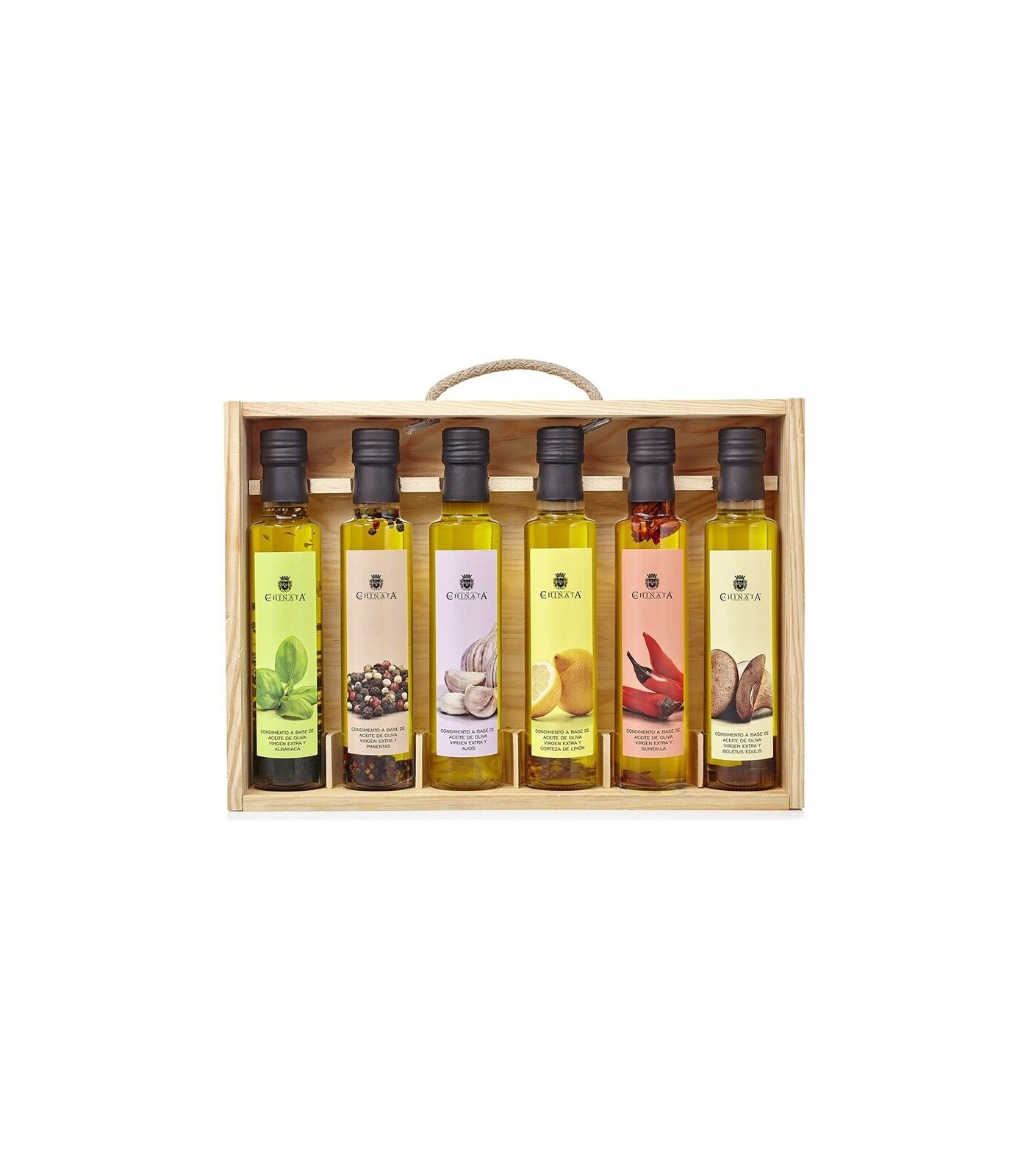 El Estuche 6 Condimentos contiene un Aceite de Olive Virgen Extra Condimentado con ; Ajo, guindilla, albahaca, boletus eduli, pimienta y limón.