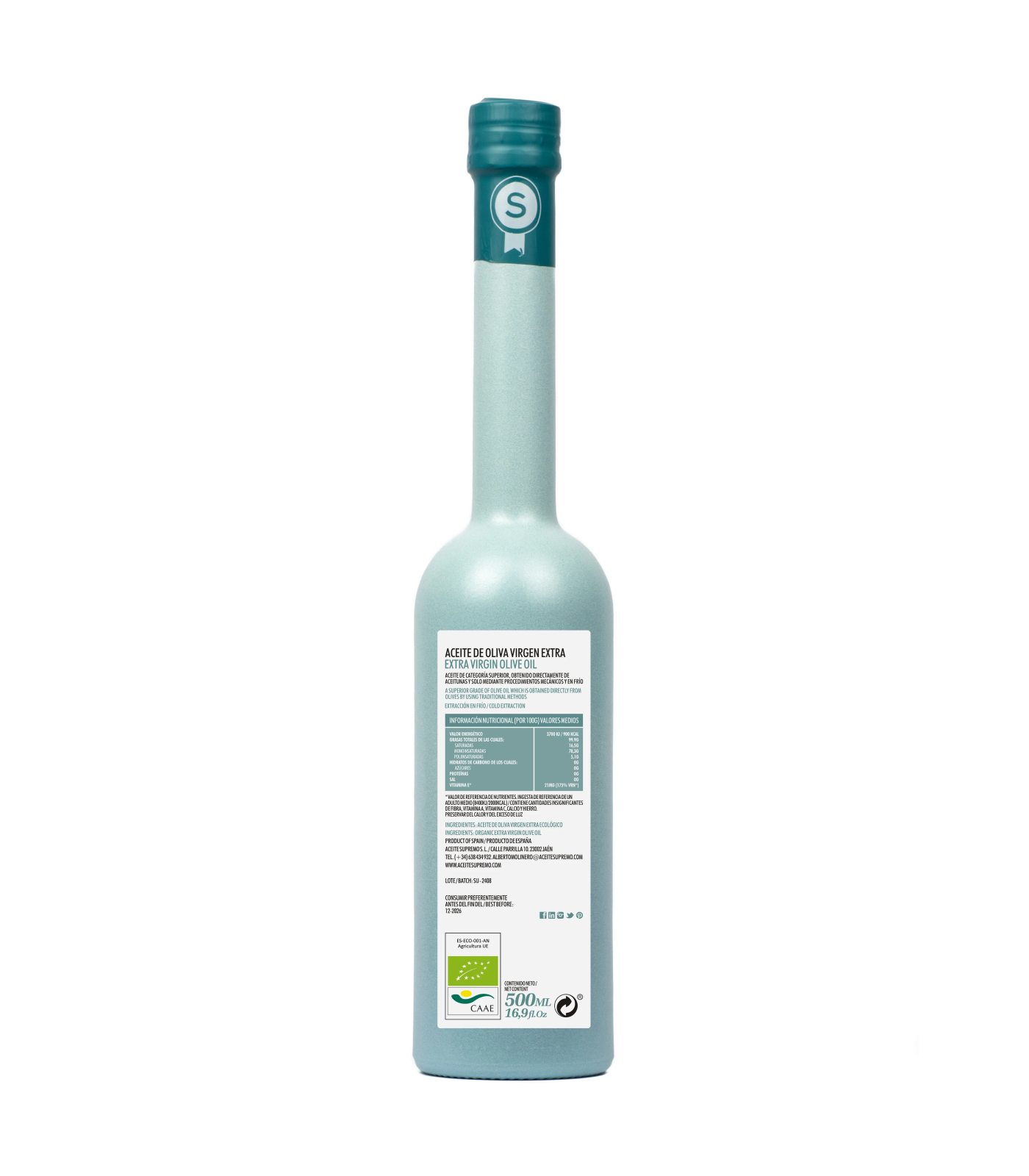 Aceite de oliva virgen extra ecológico de la variedad Royal producido en Jaén.