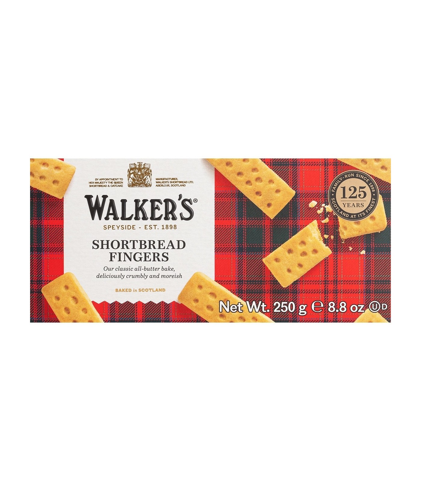 Walkers Shortbread se fundó en 1898 y es conocida como la primera marca de exportación de alimentos de Escocia. En el pueblo escocés de Aberlour elabora una gran variedad de productos, como galletas, empanadillas, tortitas de avena y platos preparados. Las galletas Walker's shortbread fingers son el producto más famoso de la marca, con su textura crujiente y desmenuzable y su sabor a mantequilla pura. Estas galletas se elaboran con una receta familiar centenaria y los mejores ingredientes naturales. Son aptos para vegetarianos y cuentan con la certificación Kosher OUD.