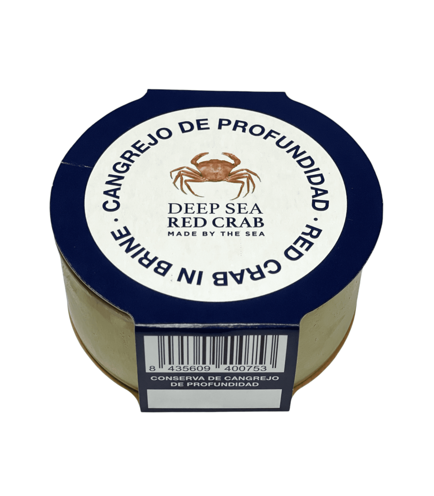 Crabe rouge d'eau profonde emballé dans une boîte métallique.