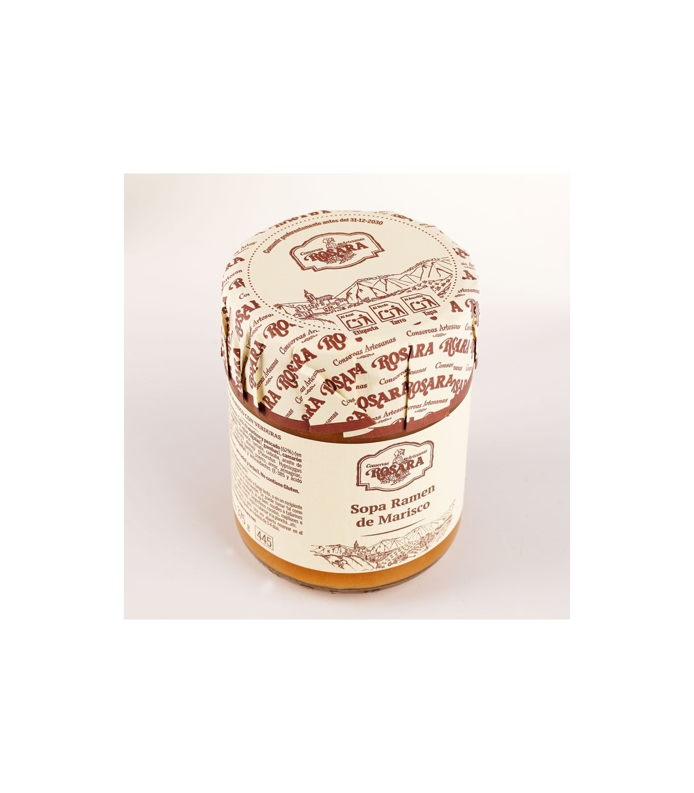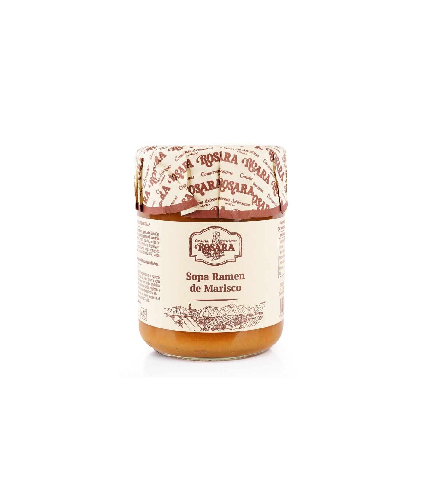La délicieuse crème de fruits de mer de Conservas Artesanas Rosara est à la base de cette soupe ramen. La saveur des langoustines, des crevettes et des gambas, associée à un bon fumet de poisson, est accompagnée, comme dans toute bonne soupe ramen, de quelques « morceaux » de carottes, de pousses de bambou et de champignons shimeji.