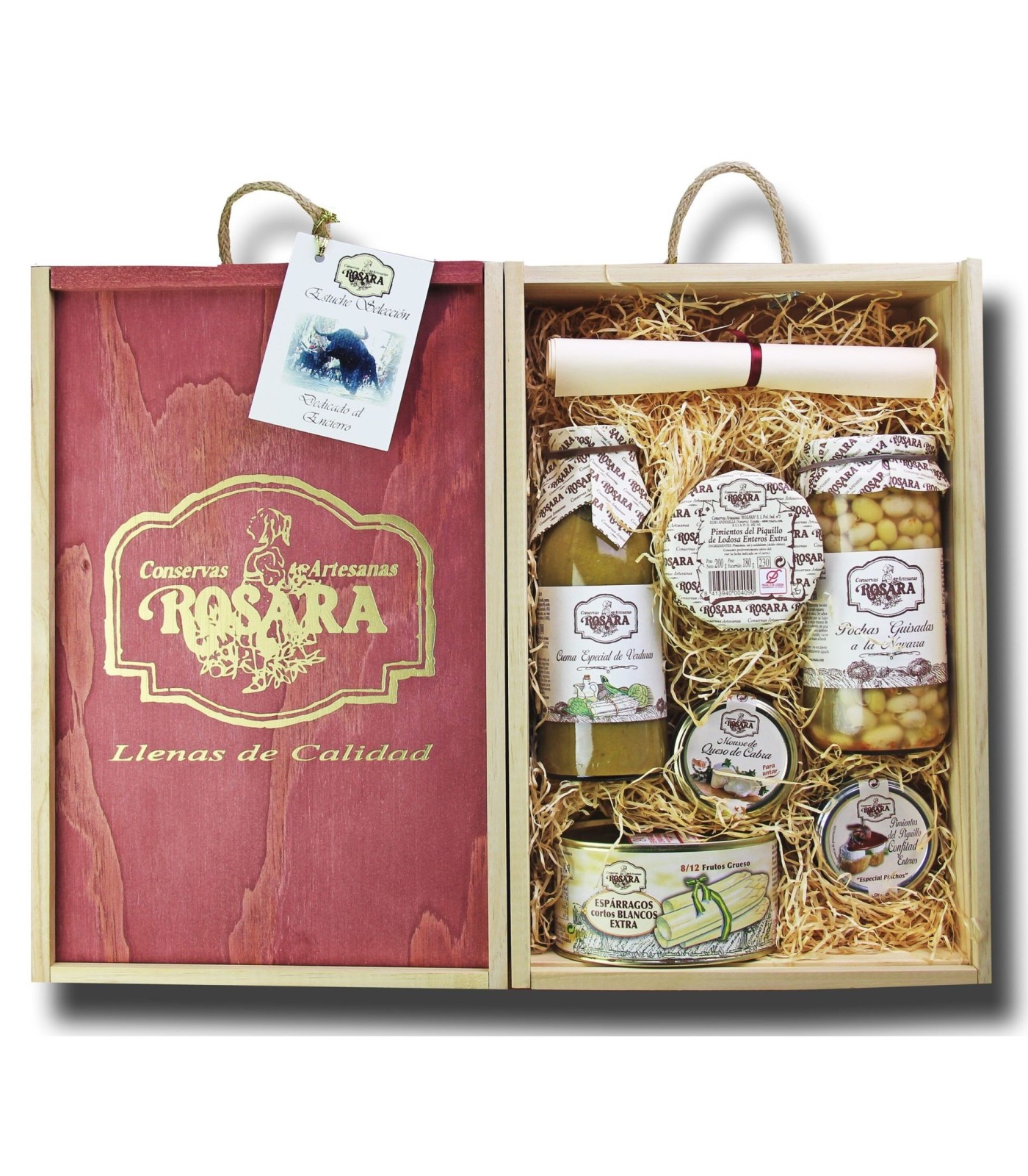 Il s'agit d'un coffret en bois contenant une sélection de produits de Conservas Artesanas Rosara. Dans ce coffret, ils ont voulu rendre hommage à l'un des symboles de la Navarre. Il s'agit de l'Encierro, une tradition connue dans le monde entier et célébrée lors des fêtes de San Fermín et de nombreuses autres fêtes patronales dans les villes et villages de Navarre. À l'intérieur de la boîte se trouve un parchemin qui raconte l'histoire de l'Encierro.