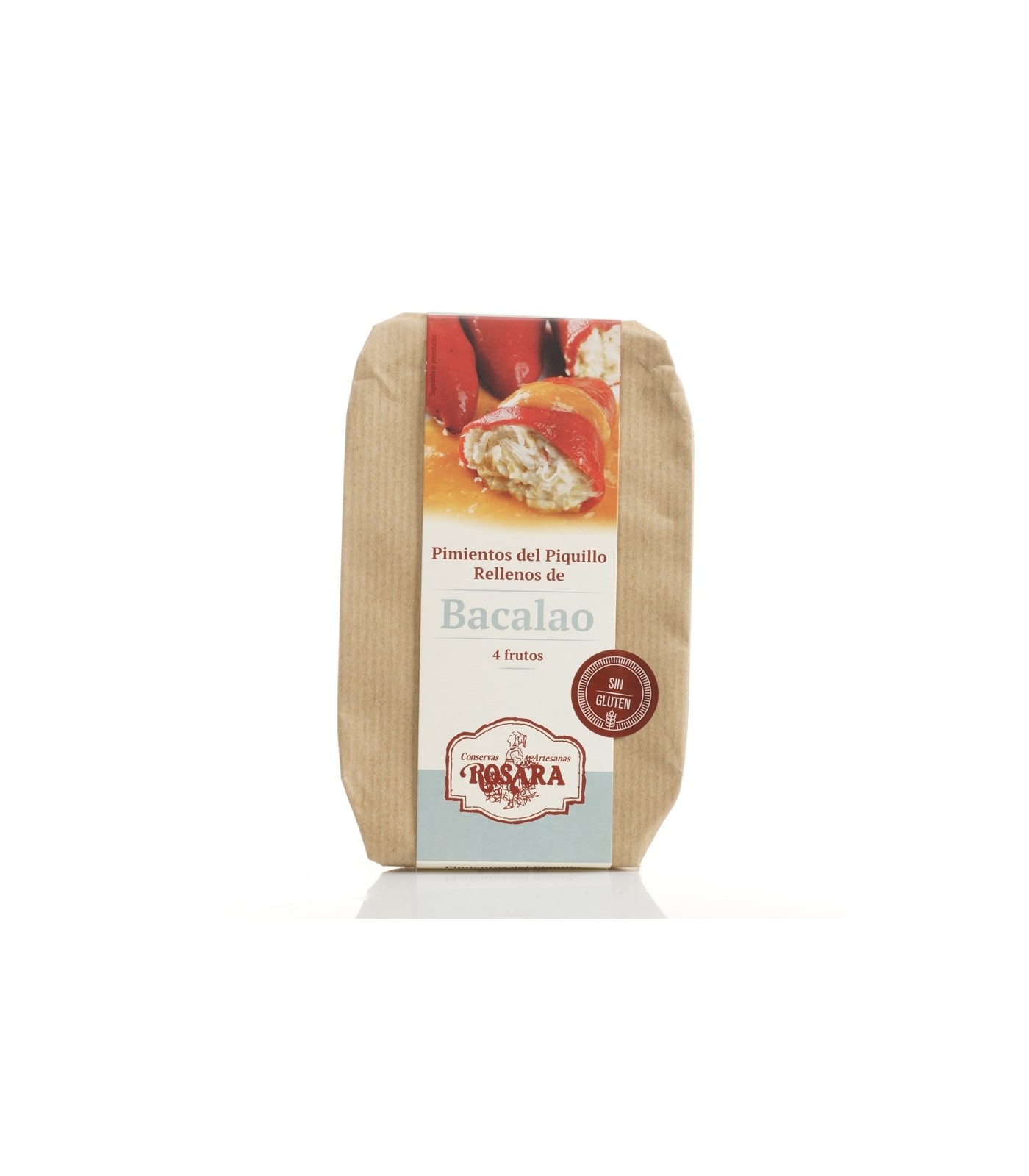 Conservas Artesanas Rosara sélectionne les meilleurs piments Piquillo et les fait griller au bois de hêtre. Ils les épluchent sans eau pour qu'ils ne perdent pas leur saveur et les remplissent d'une délicate béchamel de morue dessalée, de crevettes, de gambas et de légumes pochés. Il s'agit d'un processus très laborieux pour un résultat délicieux. Elle se distingue par sa faible teneur en matières grasses (2,6 %) et en sel (0,23 g/100 g) et ne contient pas de gluten.
