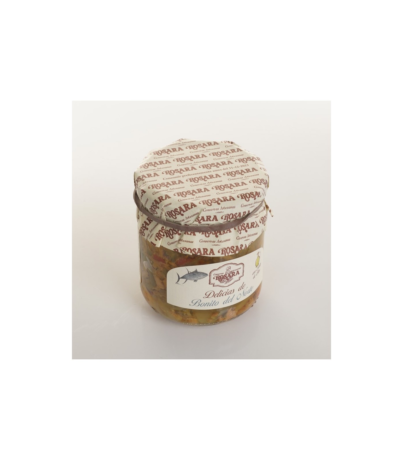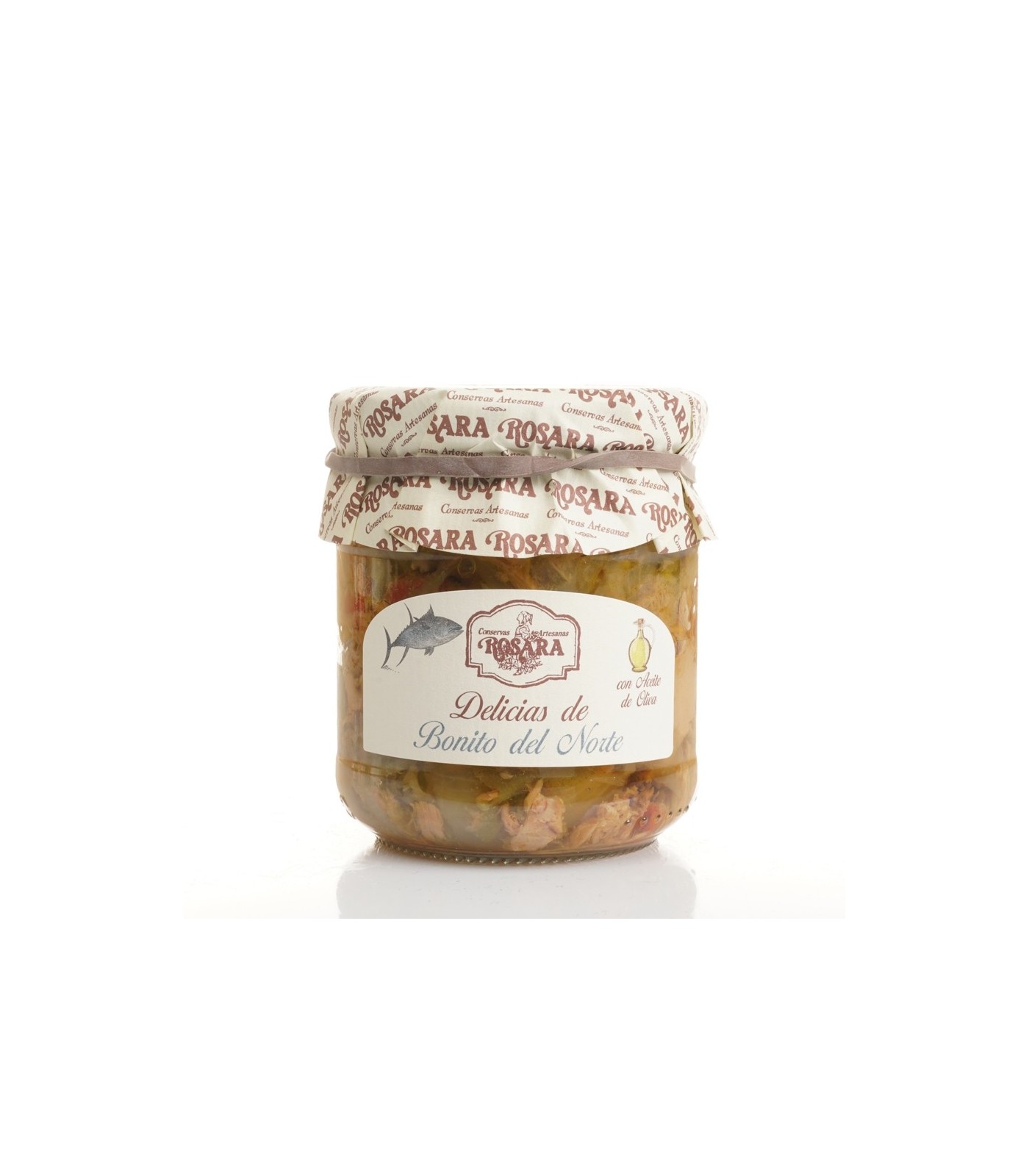 Produit spécial à base de thon blanc, de courgette, d'oignon, de poivron rouge et vert et assaisonné d'huile d'olive vierge extra. Juteux et très addictif, il est recommandé de le consommer froid et il est idéal comme tapa ou amuse-gueule et comme ingrédient pour les salades, les omelettes et les tartes.