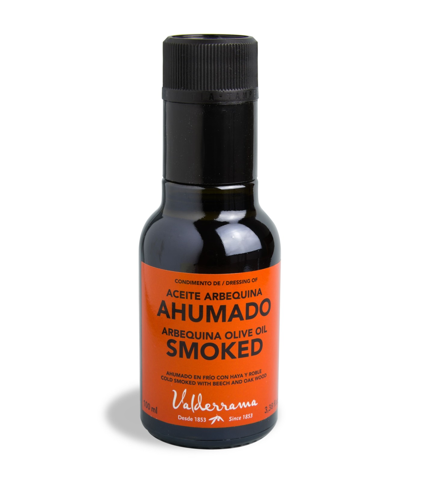 Huile d'Olive Vierge Extra de la variété Arbequina fumée au chêne et hêtre par des artisans du fumage. Elle ne perd aucune de ses qualités fruitées lors du fumage à froid mais acquiert un arôme original et un goût singulier. Équilibrée, avec des notes de vanille et de café qui complètent la fraîcheur fruitée de l'Arbequina.