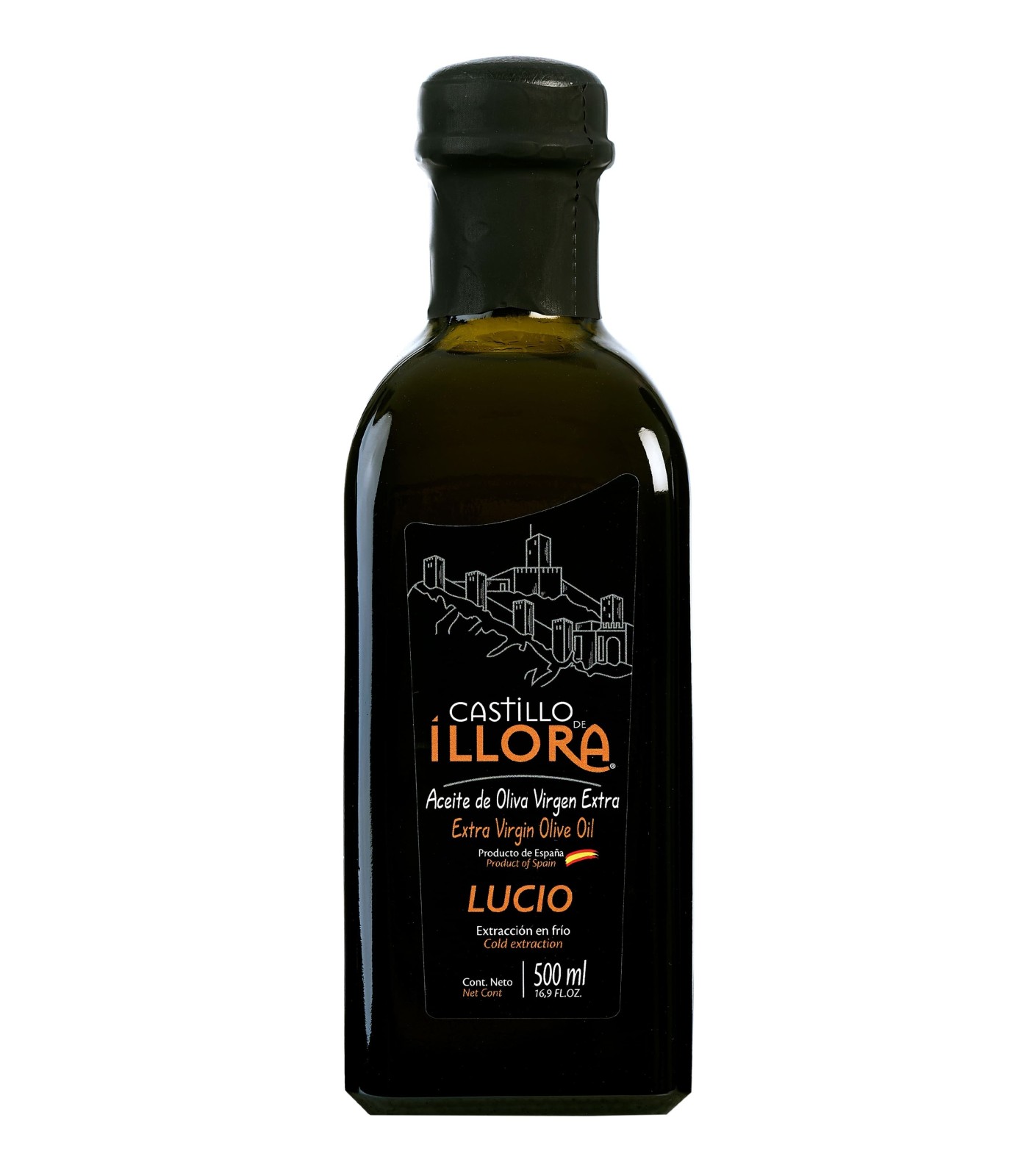 Huile d'olive vierge extra de récolte précoce et d'extraction à froid produite à Íllora (Grenade) avec des olives de la variété Lucio.