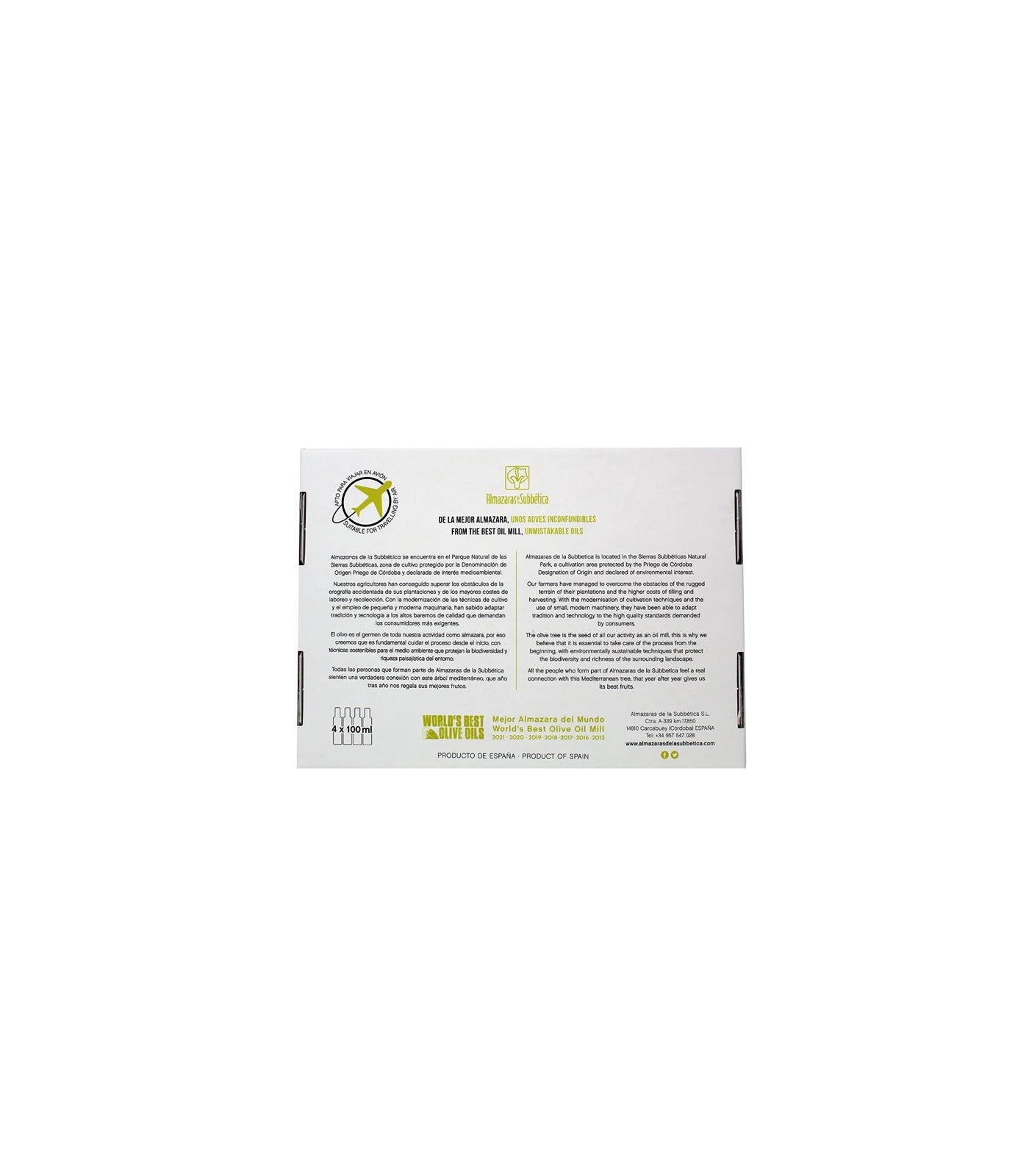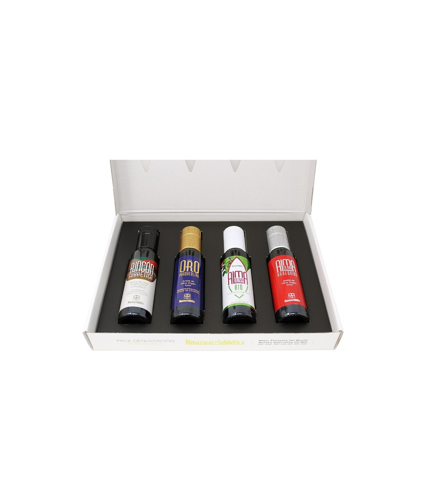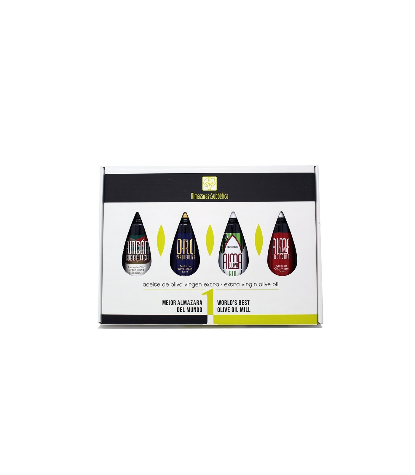 Pack de dégustation composé de 4 bouteilles de 100 ml. d'huile d'olive vierge extra de Almazaras de la Subbética, produite à Carcabuey (Córdoba).