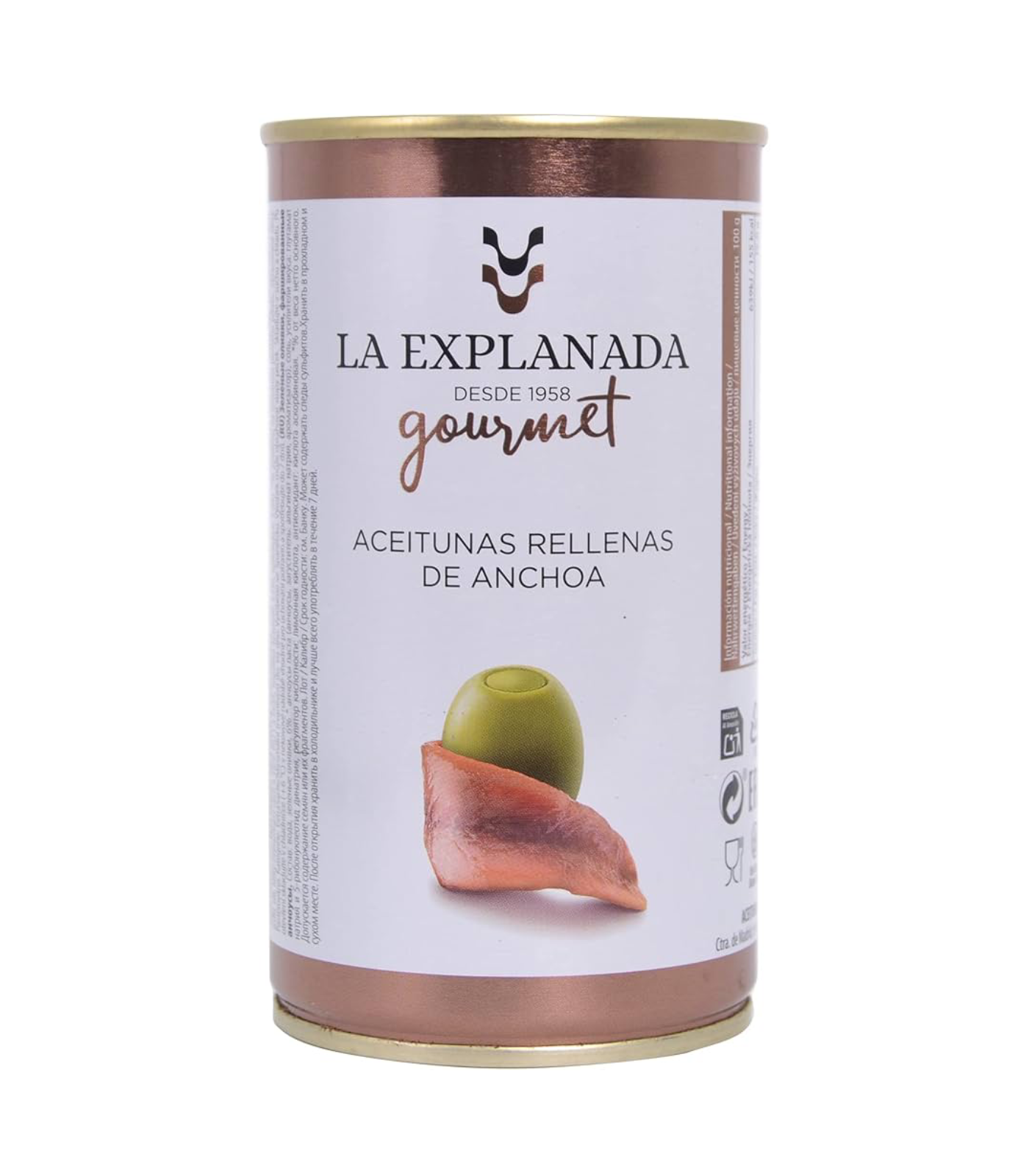 Les olives farcies aux anchois de La Explanada sont un classique, élevé au rang de gourmet. Sélectionnées pour leur texture ferme et leur goût authentique, elles cachent un cœur d'anchois qui apporte une touche salée irrésistible. Chaque bouchée est un équilibre parfait entre douceur et intensité.