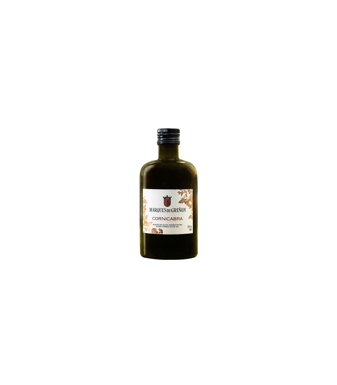 Huile d'olive vierge extra provenant d'oliviers centenaires de la variété Cornicabra, de couleur légèrement verdâtre et brillante.