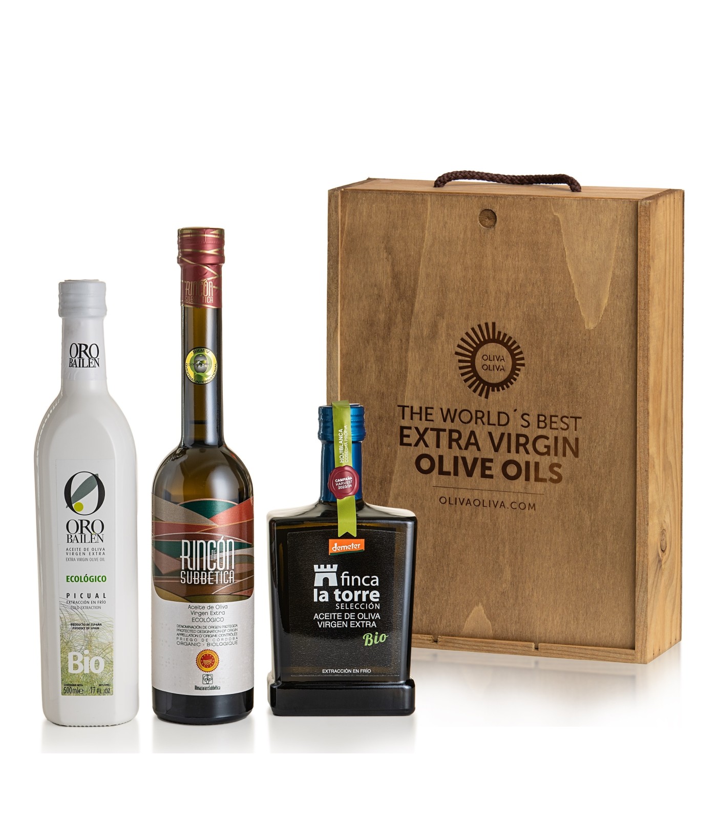 Ce coffret en bois comprend les 3 meilleures huiles d'olive vierge extra BIO d'Espagne en 2024, récompensées par le prix Alimentos de España pour la production biologique.