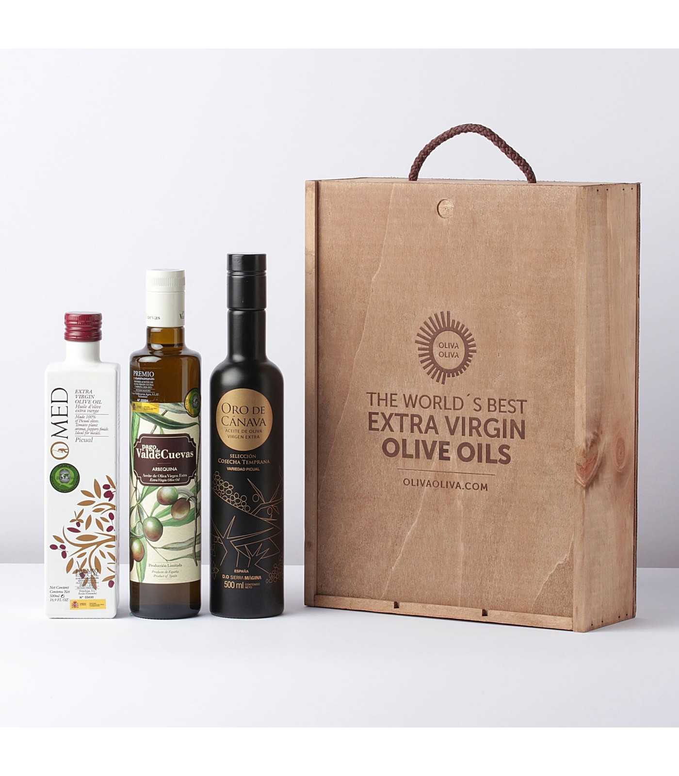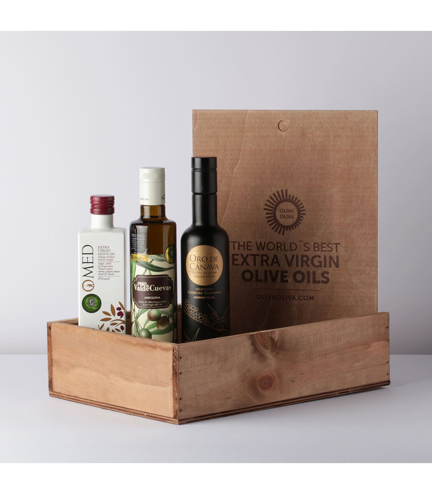 Ce coffret en bois comprend les 3 meilleures huiles d'olive vierge extra d'Espagne en 2021, récompensées par le prix Alimentos de España.