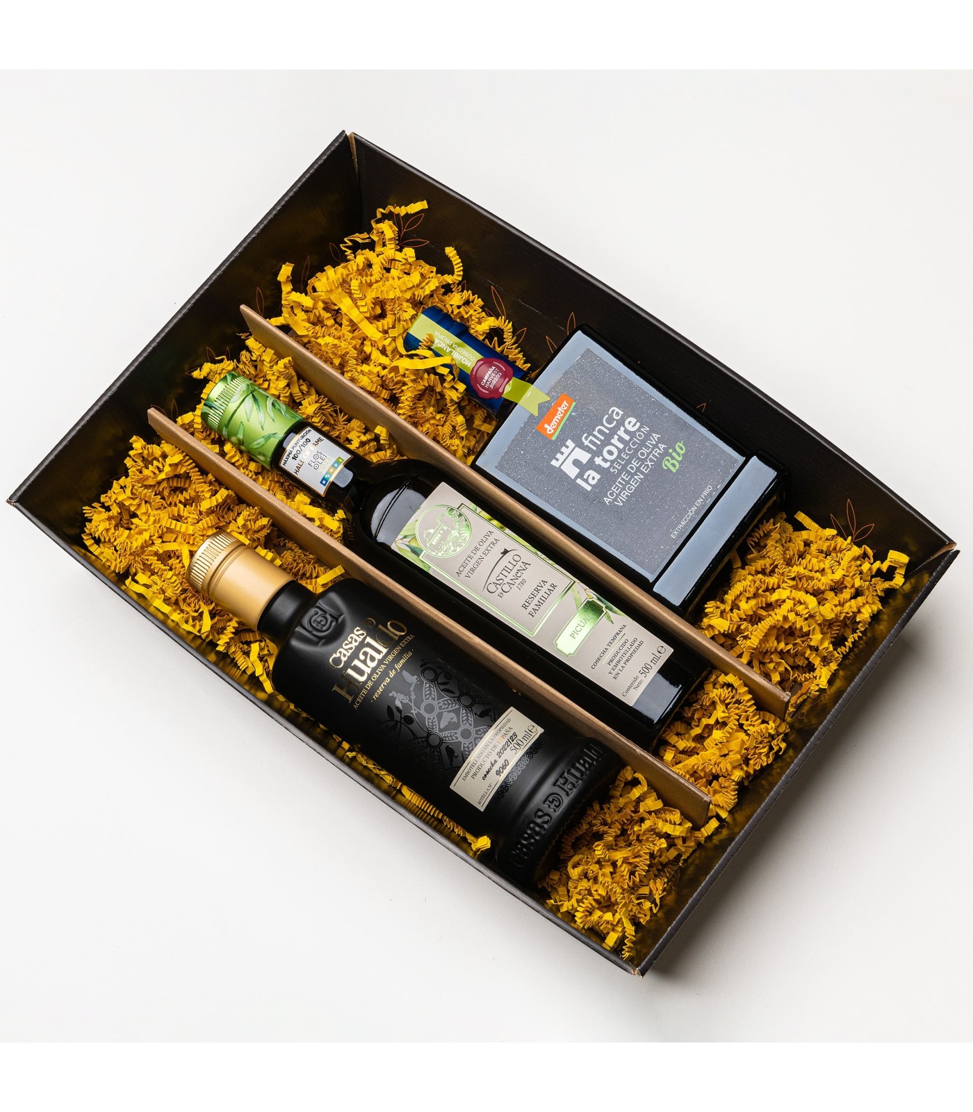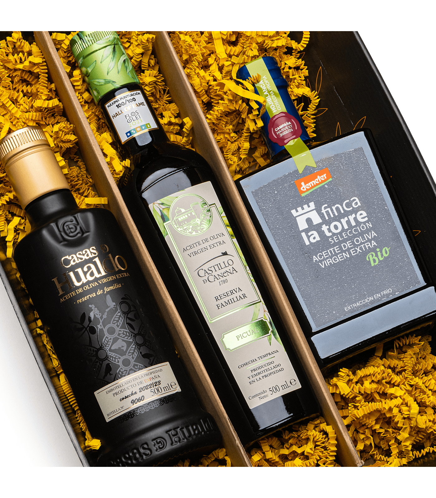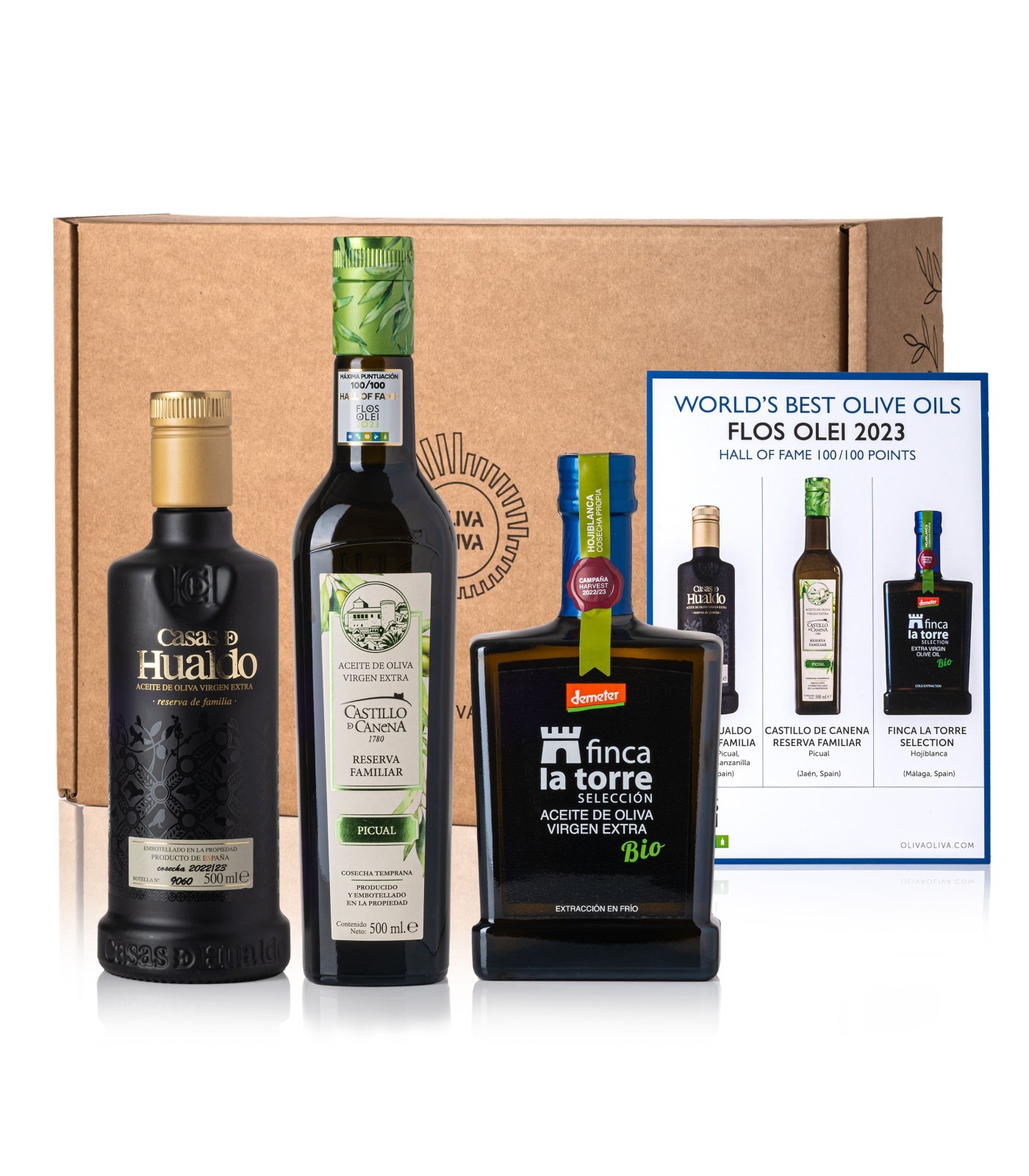 Ce coffret comprend les 3 meilleures huiles d'olive vierges extra du monde en 2023 selon le prestigieux guide international des huiles d'olive vierges extra Flos Olei.