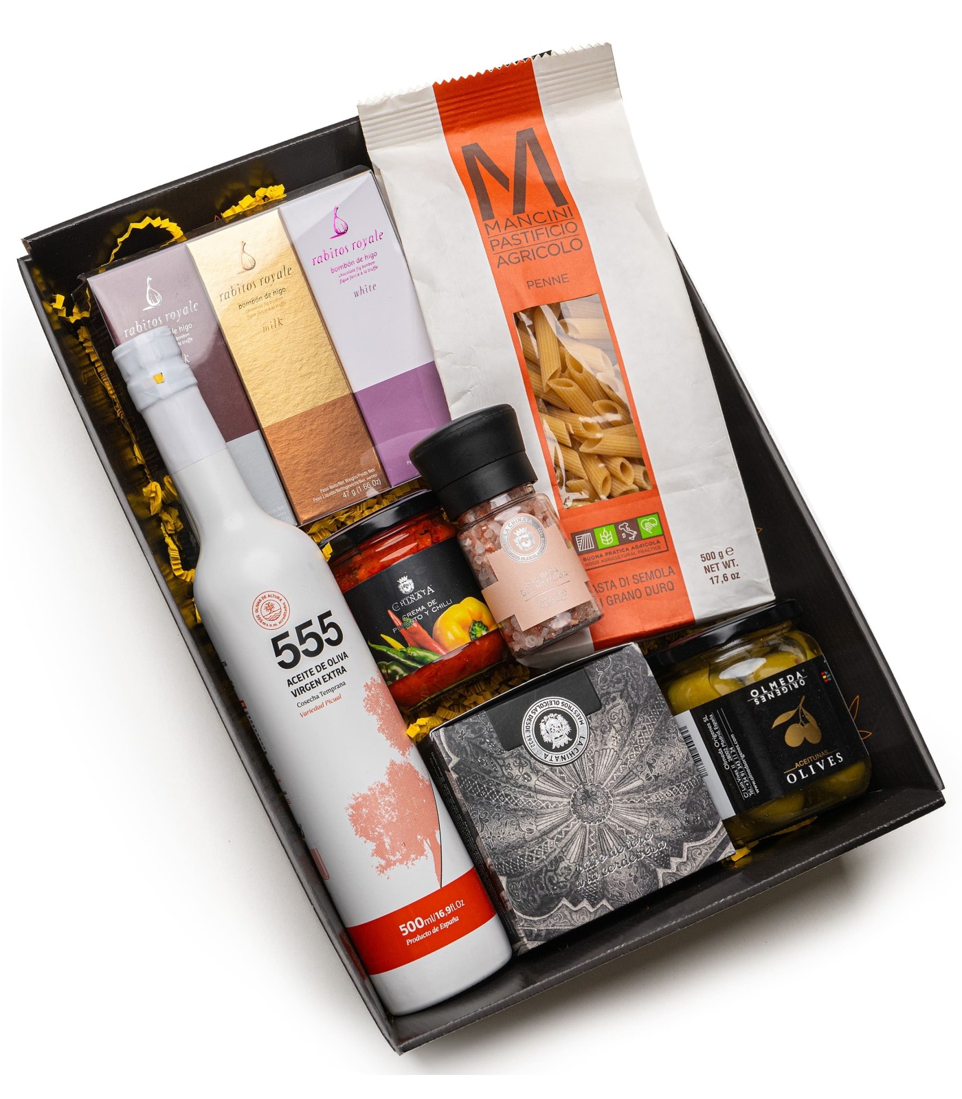 Le coffret surprise Oliva Oliva Classic comprend au moins une bouteille d'huile d'olive extra vierge de qualité supérieure et une gamme de produits gourmet soigneusement sélectionnés parmi les meilleures marques.