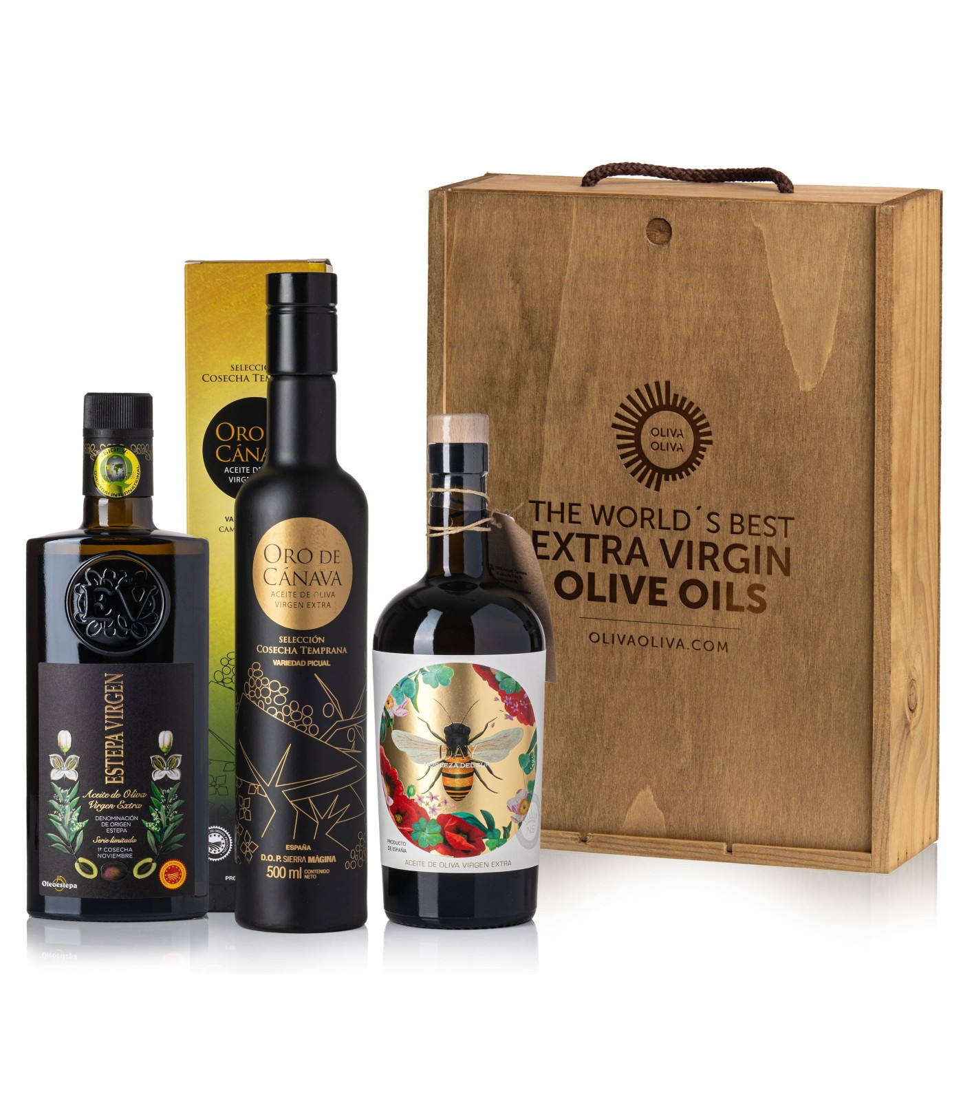 Ces huiles sont présentées dans un élégant coffret en bois comprenant 3 bouteilles de 500 ml et un diplôme certifiant le prix.