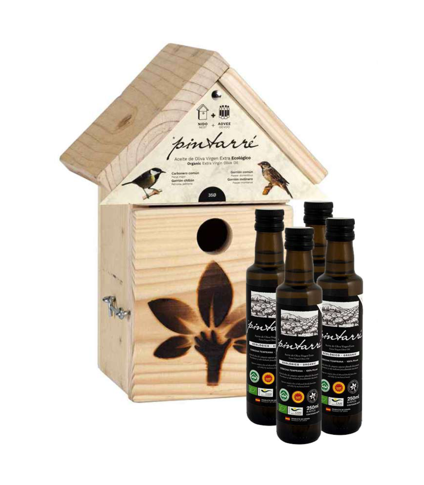 Ce nichoir comprend 4 bouteilles d'huile d'olive vierge extra biologique Pintarré Envero BIO Récolte Précoce 250 ml.