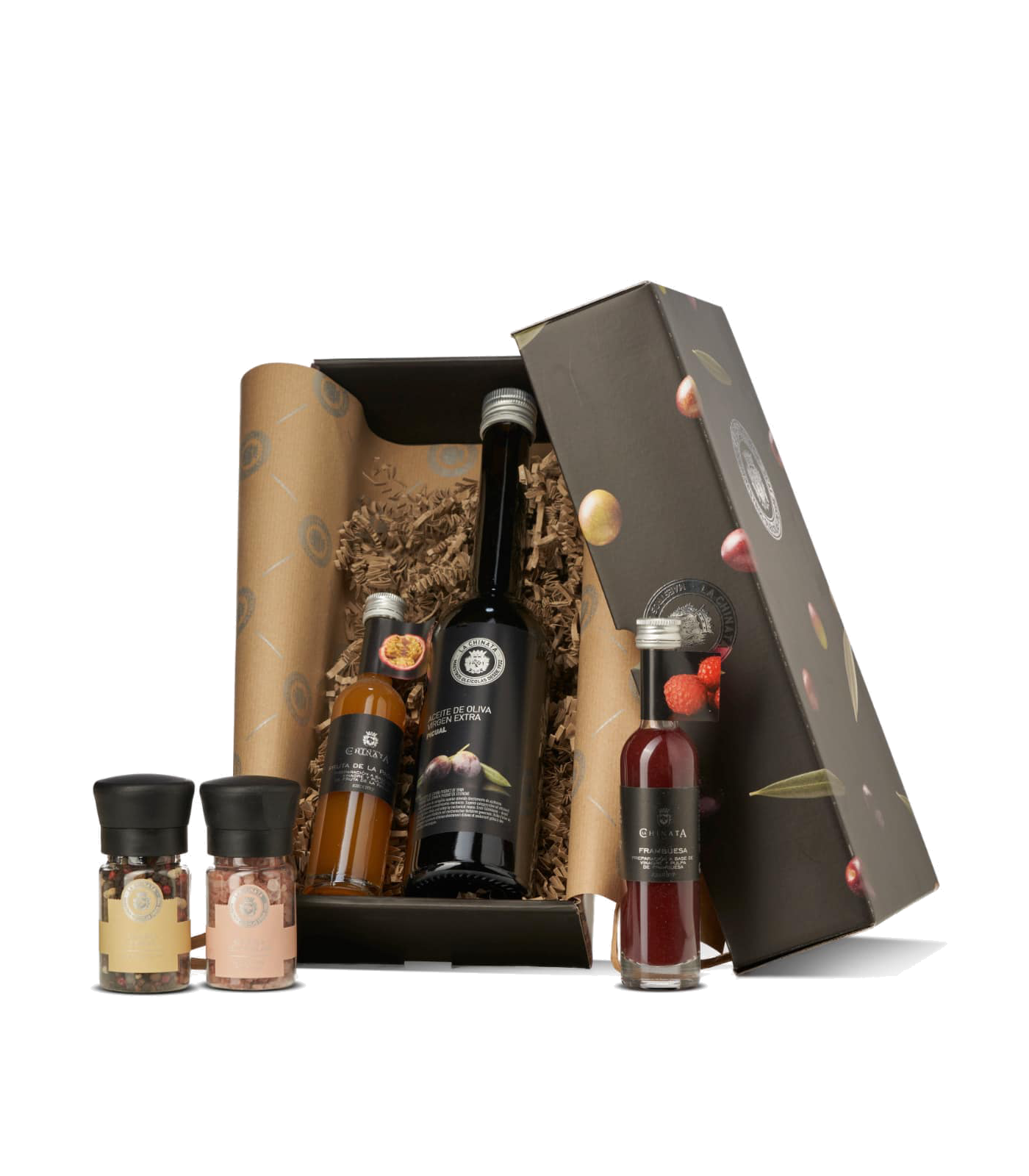 La Chinata's Box Aliño Nº2 contient des condiments exquis aux saveurs exotiques provenant d'une sélection de produits de qualité supérieure tels que le fruit de la passion ou le poivre de Sechuan, pour donner une touche unique et très distinctive aux salades ou à tout autre plat.