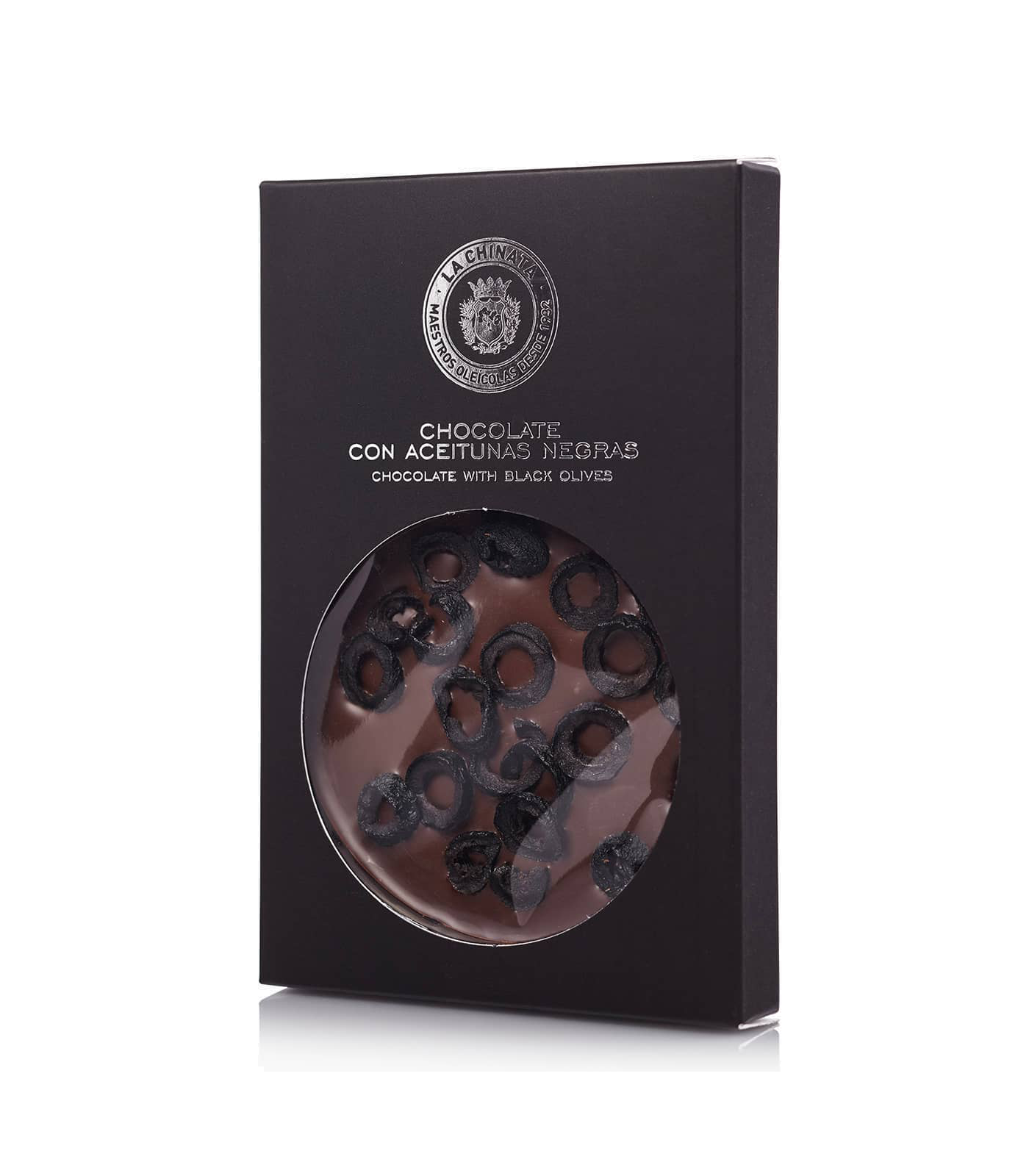 Il s'agit d'un chocolat fin et croquant à la forme arrondie, accompagné d'olives noires déshydratées qui lui donnent une touche fraîche et unique avec une pointe de sel.