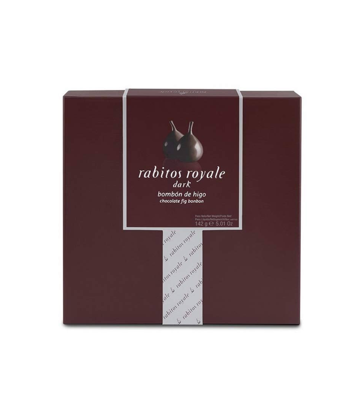 Il s'agit d'une boîte de chocolats noirs Fig Rabitos Royale, contenant environ 8 unités de délicieux bonbons aux figues.